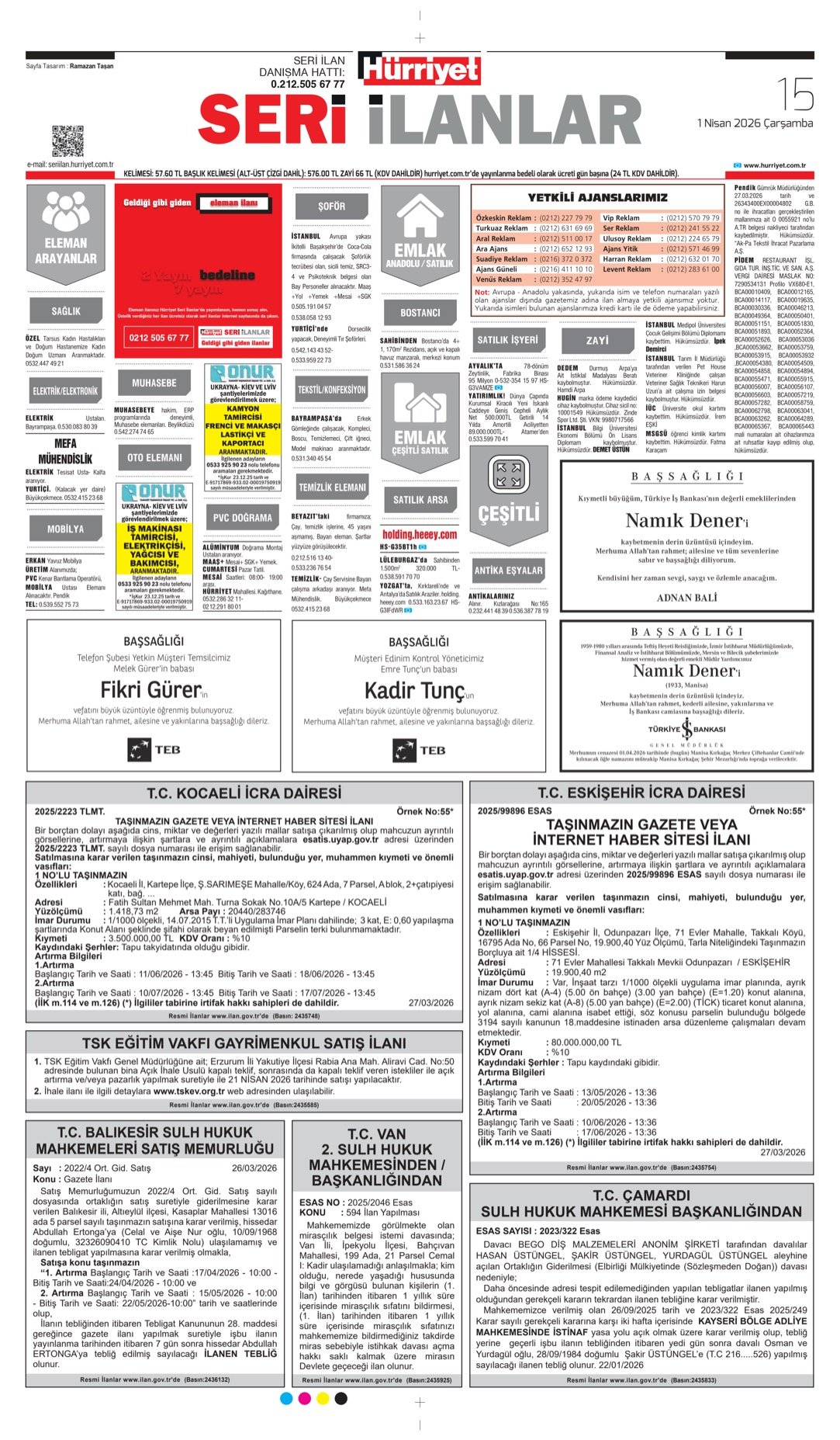 1 Nisan 2026-Hürriyet Bugünkü Vefat (Ölüm) – Başsağlığı – Anma – Teşekkür – Mevlit İlanları.