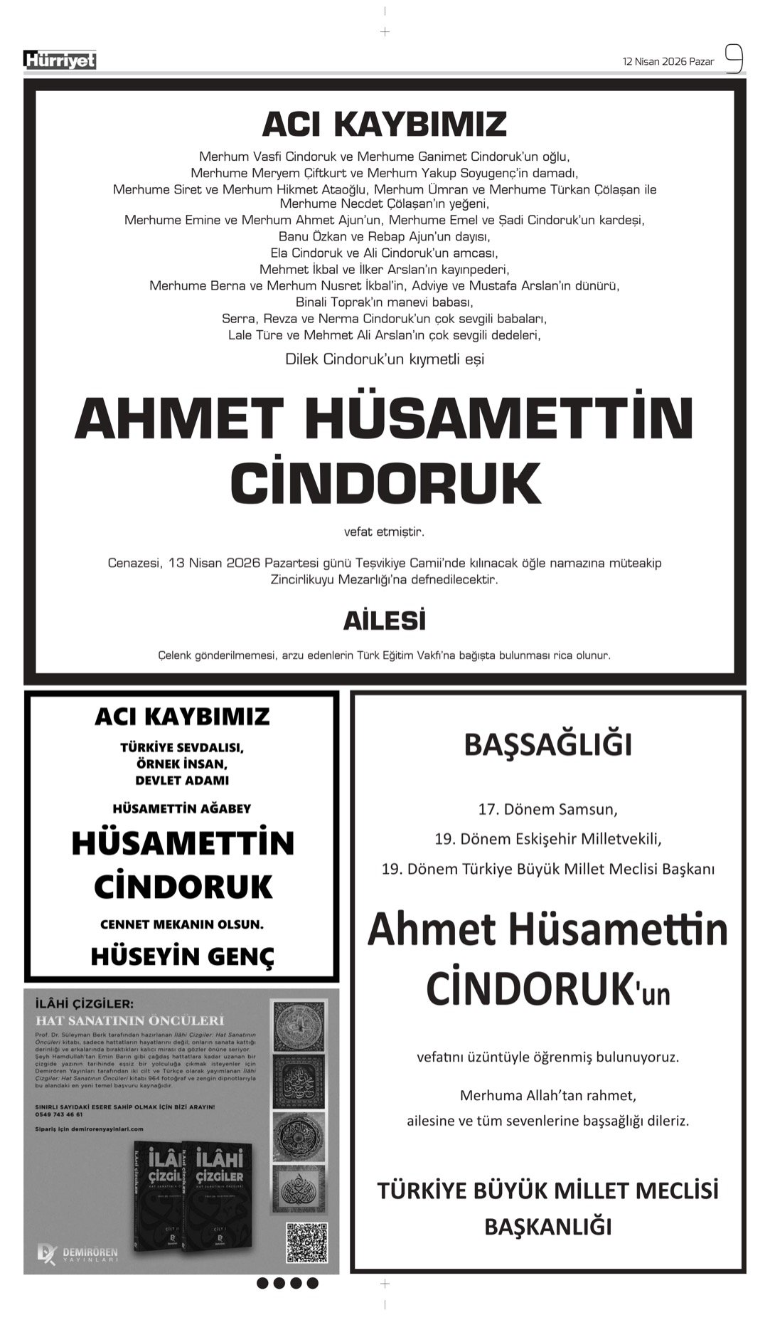 12 Nisan 2026 Hürriyet Gazetesi vefat, başsağlığı ve anma ilanları.