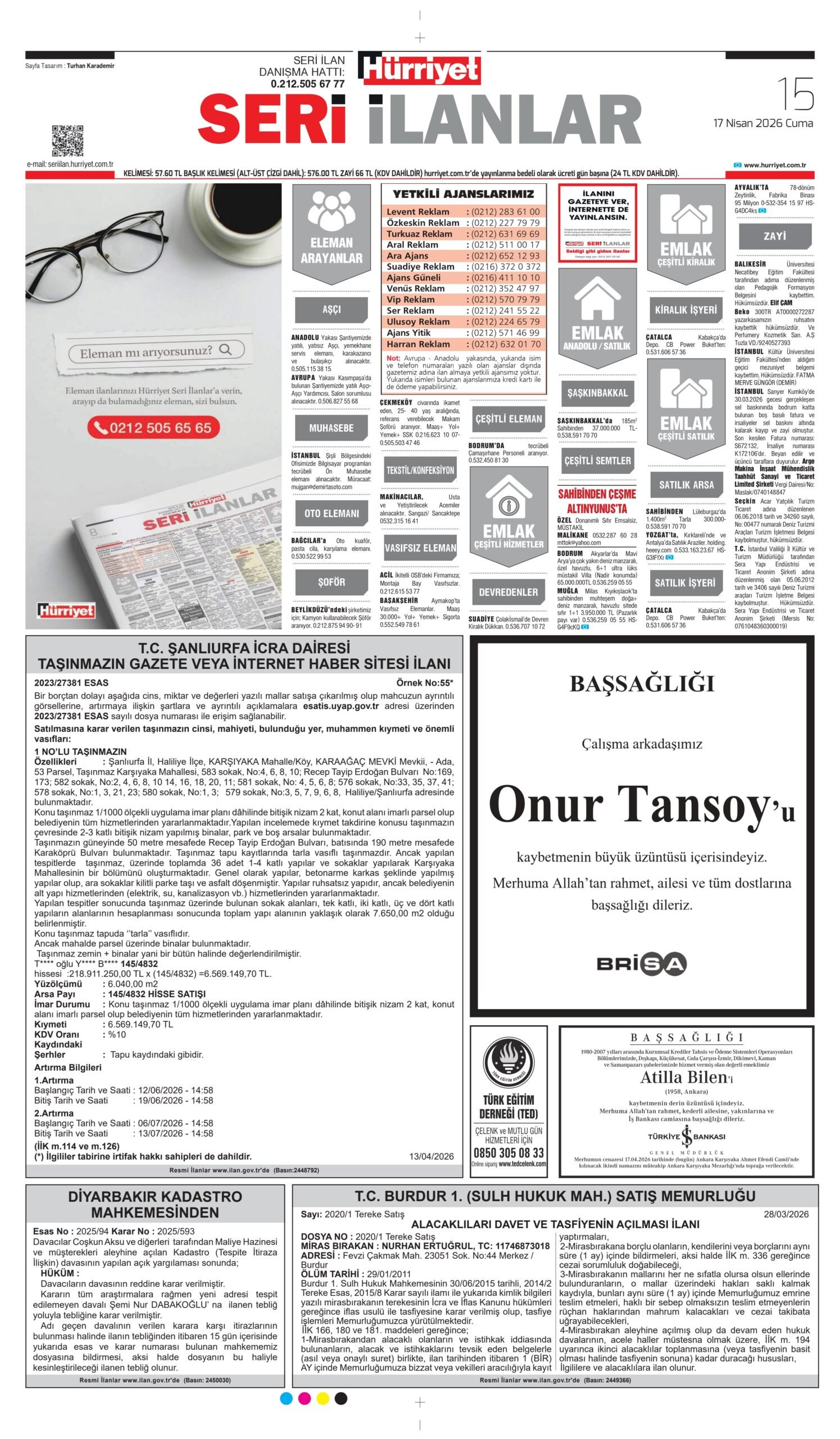 17 Nisan 2026 Hürriyet Gazetesi vefat, başsağlığı ve anma ilanları.