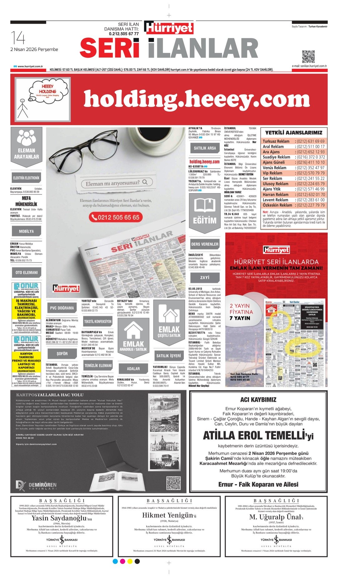 2 Nisan 2026-Hürriyet Bugünkü Vefat (Ölüm) – Başsağlığı – Anma – Teşekkür – Mevlit İlanları.