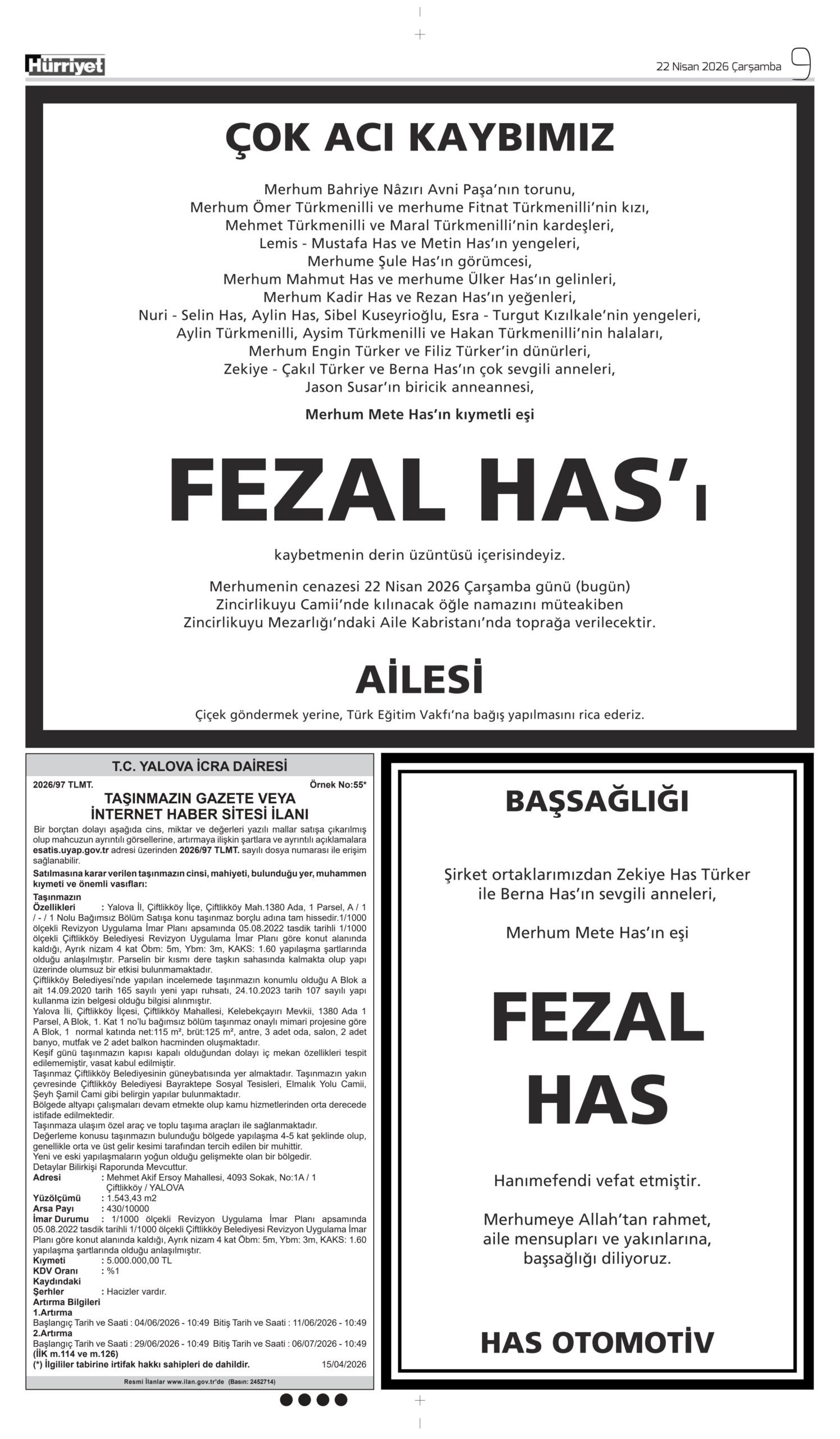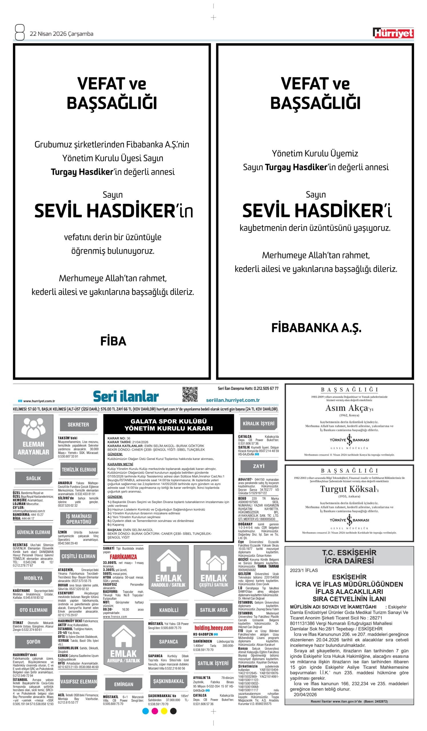 22 Nisan 2026 Hürriyet Gazetesi vefat, başsağlığı ve anma ilanları.