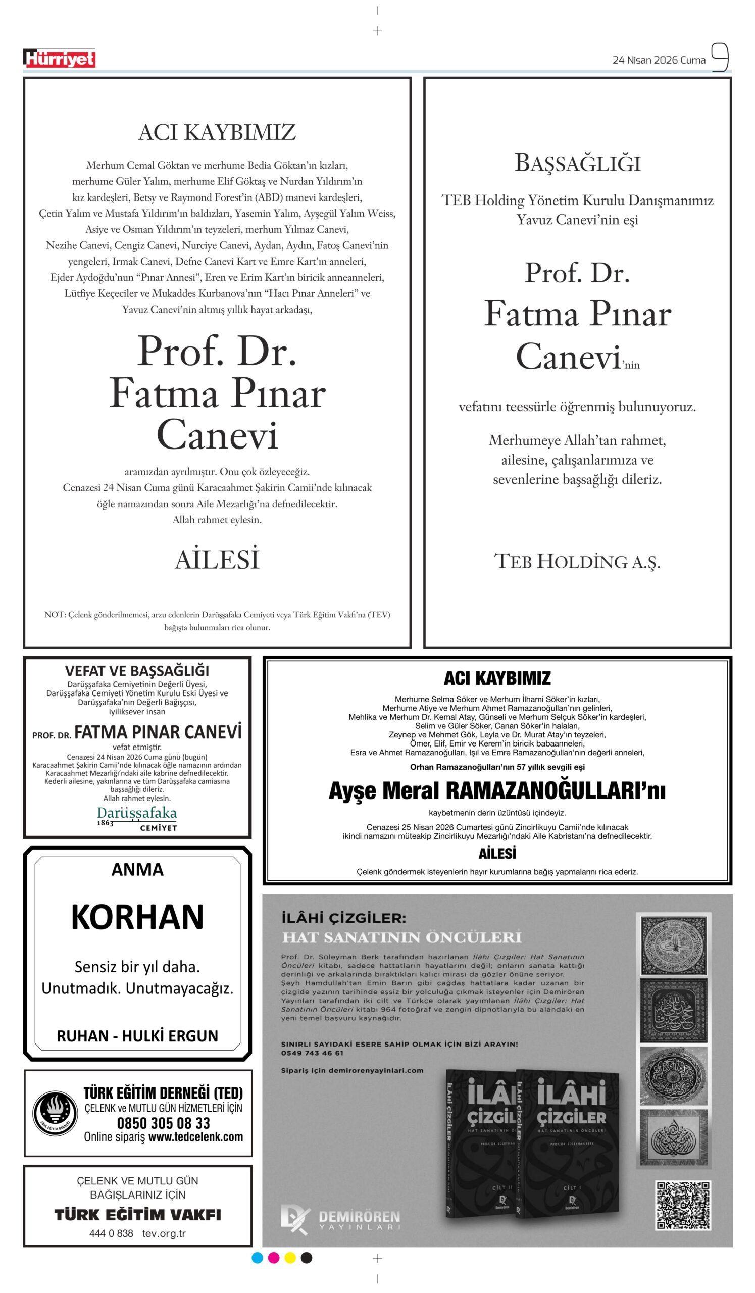 24 Nisan 2026 tarihli Hürriyet Gazetesi vefat, başsağlığı ve anma ilanları.