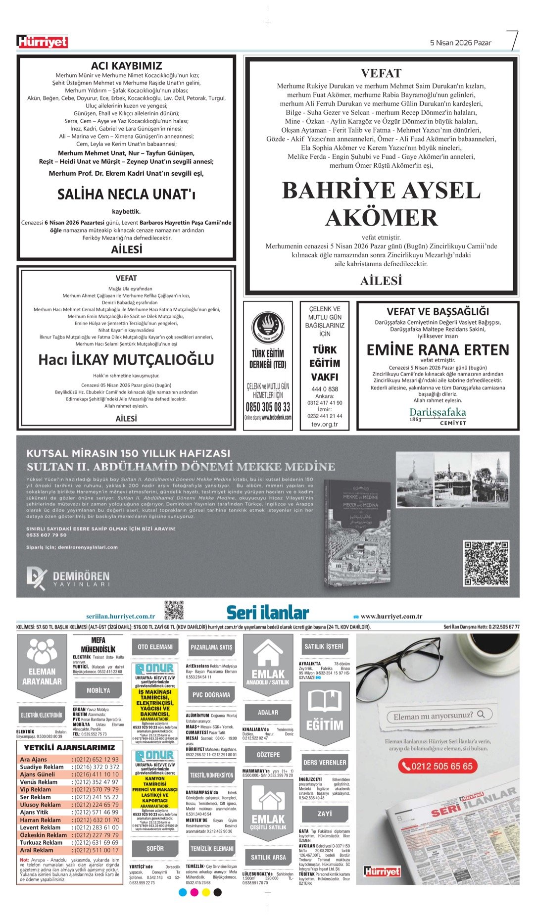 5 Nisan 2026-Hürriyet Bugünkü Vefat (Ölüm) – Başsağlığı – Anma – Teşekkür – Mevlit İlanları.