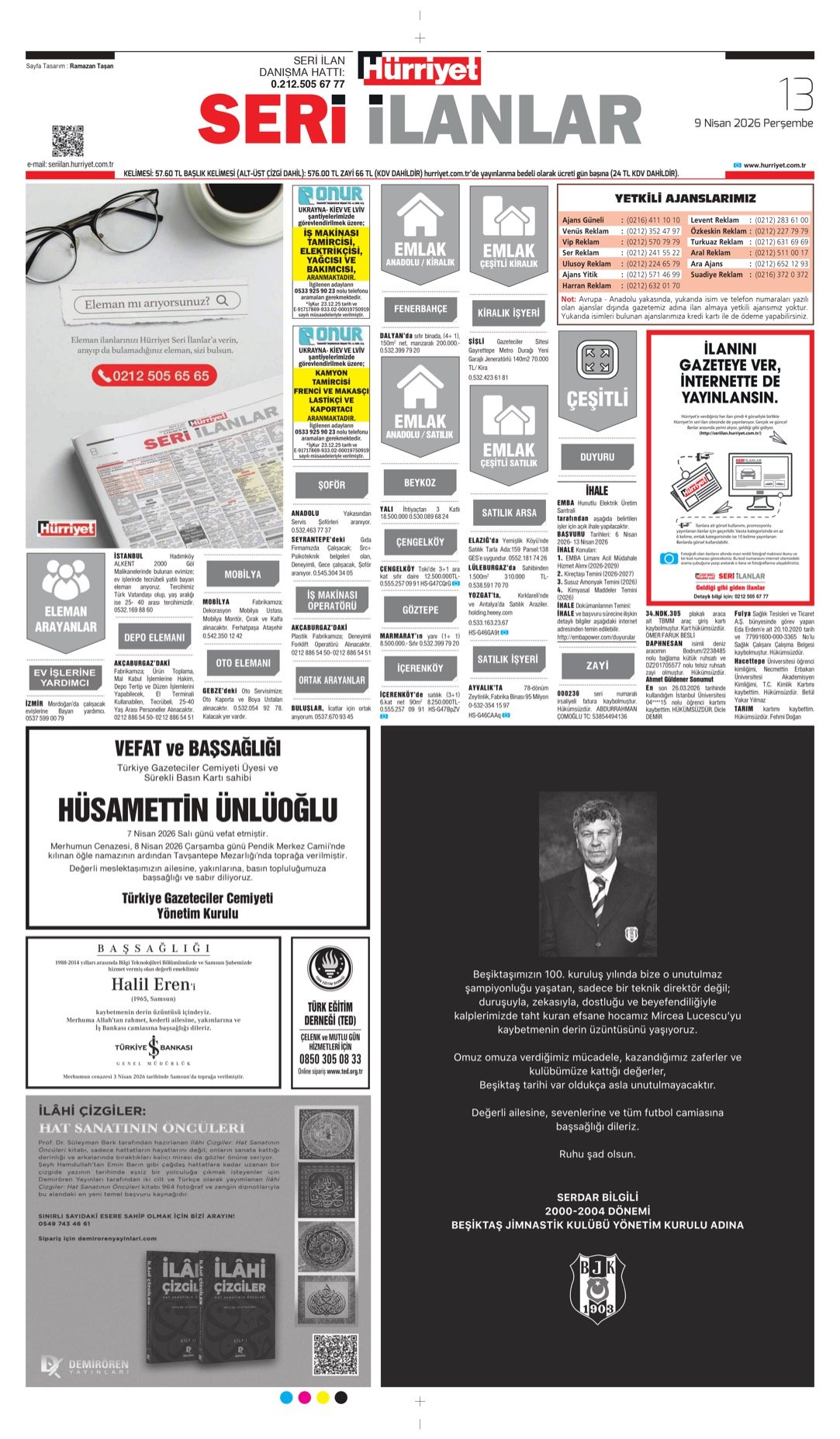 Hürriyet Bugünkü Vefat (Ölüm) – Başsağlığı – Anma – Teşekkür – Mevlit İlanları-31.8.2025FATİH YÜCELİK - VEFAT İLANI, AHMET İLHAN KEFELİ - …