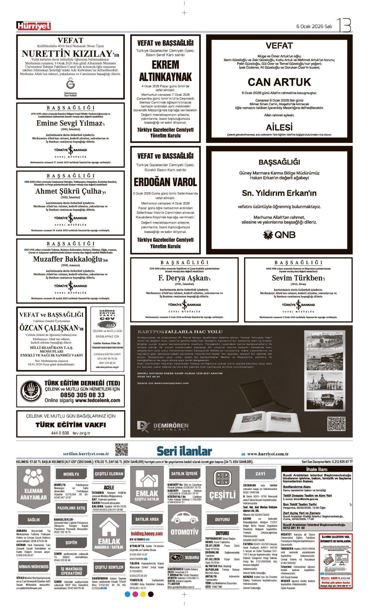Hürriyet Bugünkü Vefat (Ölüm) – Başsağlığı – Anma – Teşekkür – Mevlit İlanları-6.1.2026