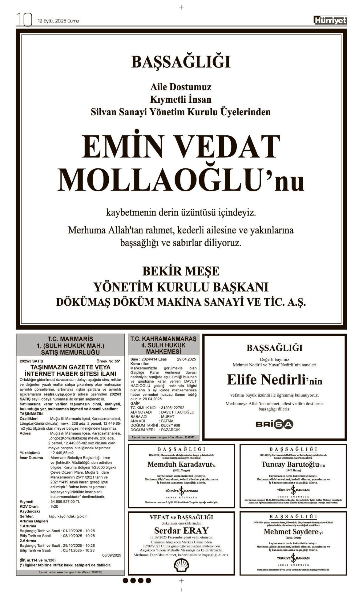 Hürriyet Bugünkü Vefat (Ölüm) – Başsağlığı – Anma – Teşekkür – Mevlit İlanları-12.9.2025