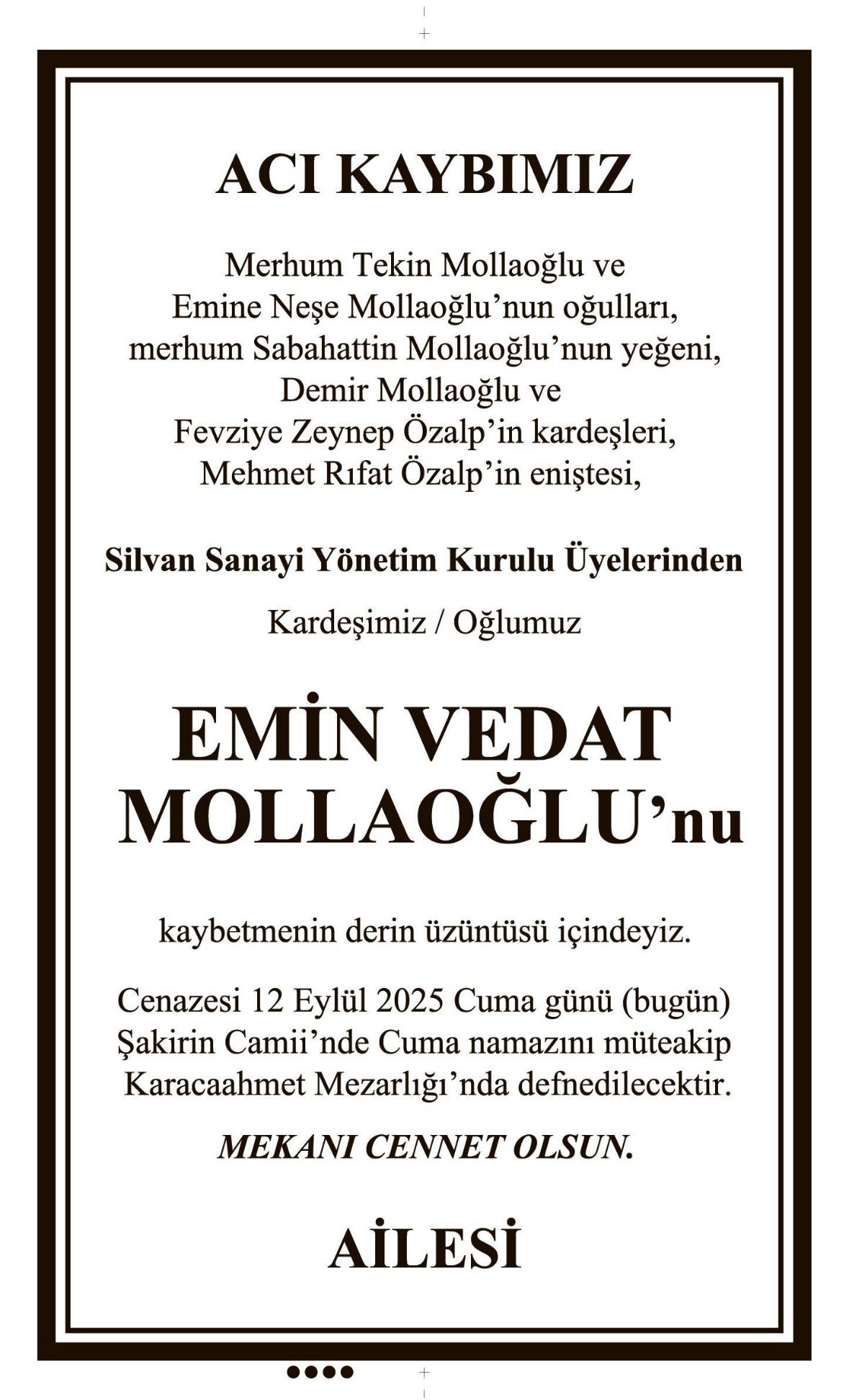 - EMİN VEDAT MOLLAOĞLU – VEFAT İLANI,