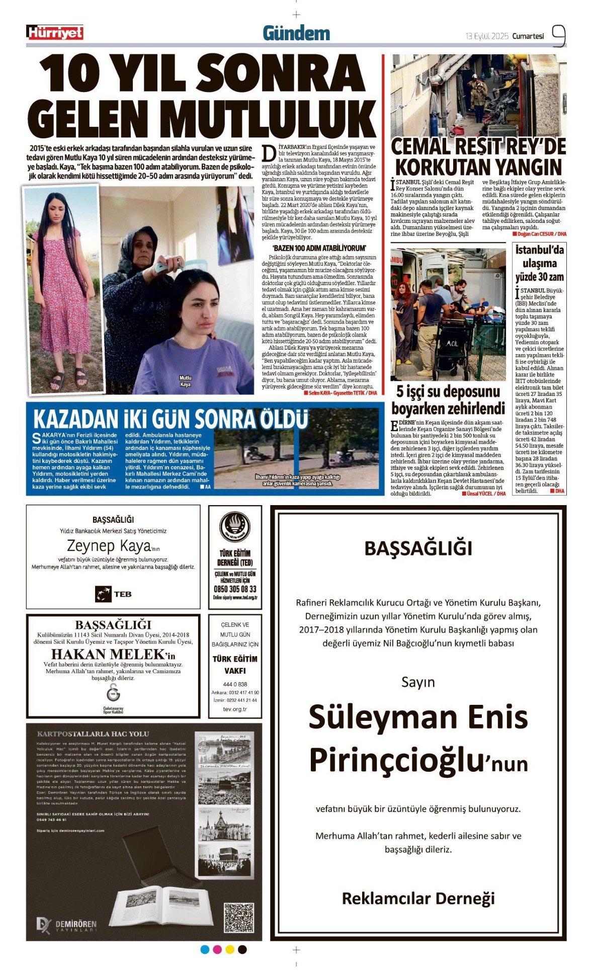 Hürriyet Bugünkü Vefat (Ölüm) – Başsağlığı – Anma – Teşekkür – Mevlit İlanları-13.9.2025