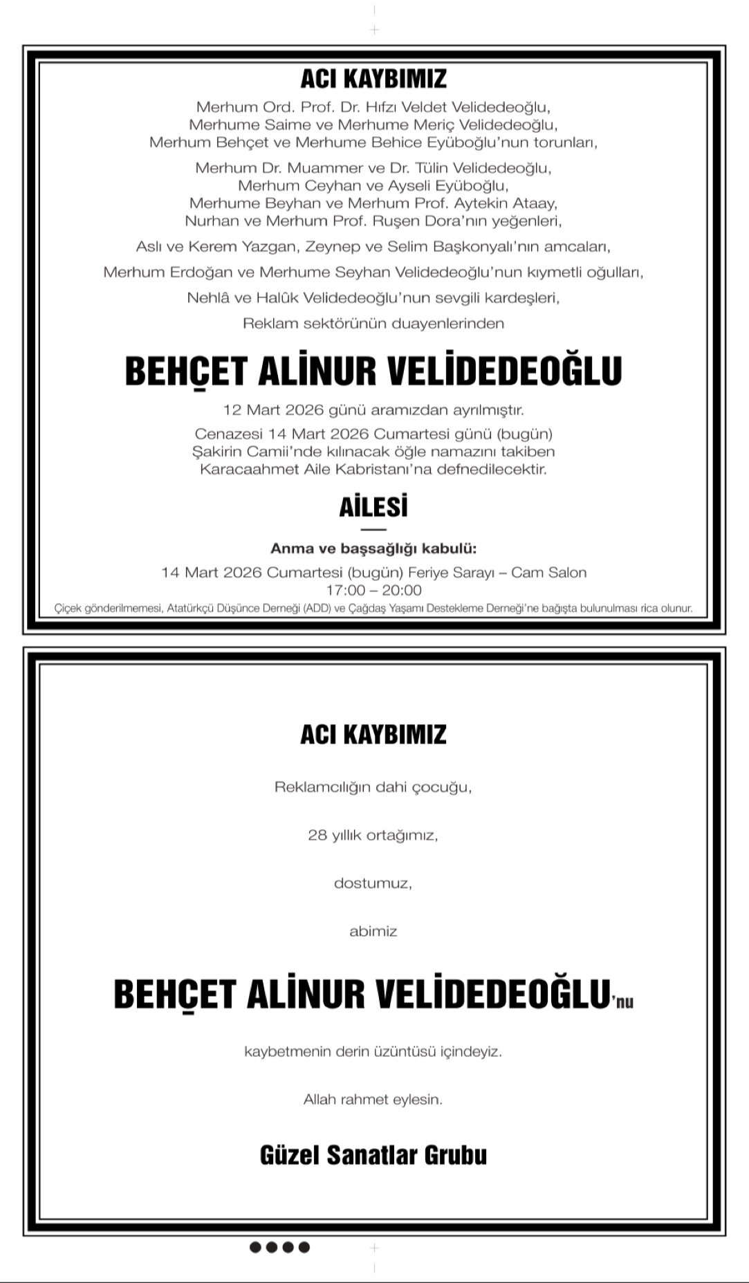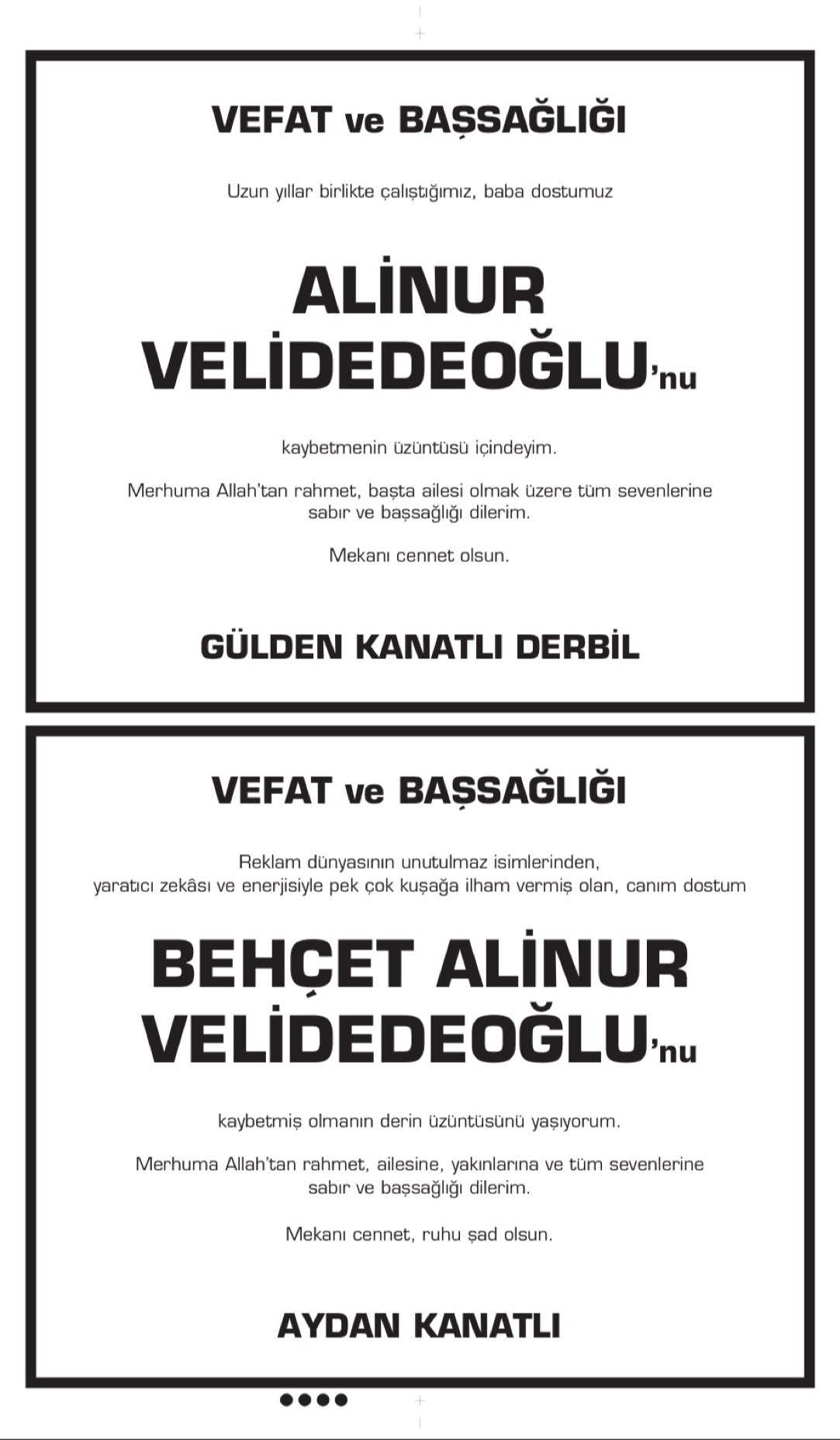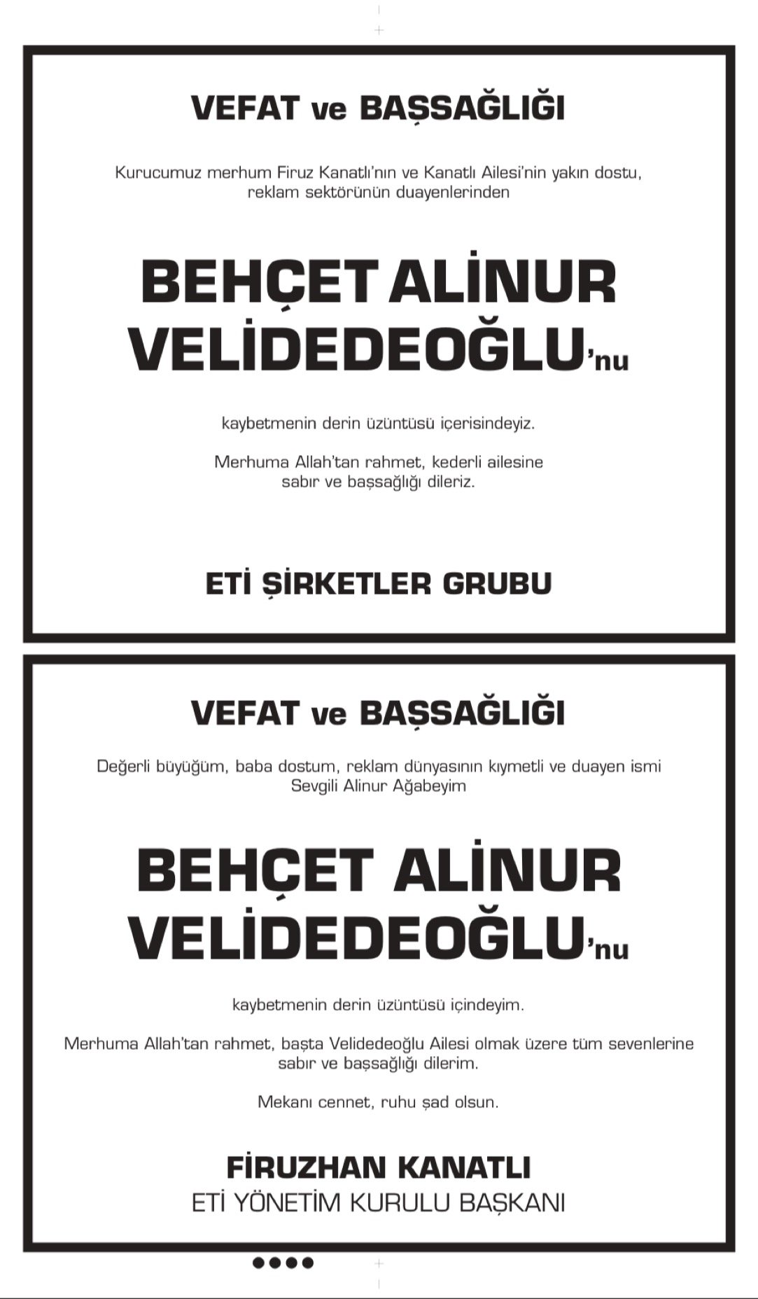 - BEHÇET ALİNUR VELİDEDEOĞLU, Vefat İlanı,
