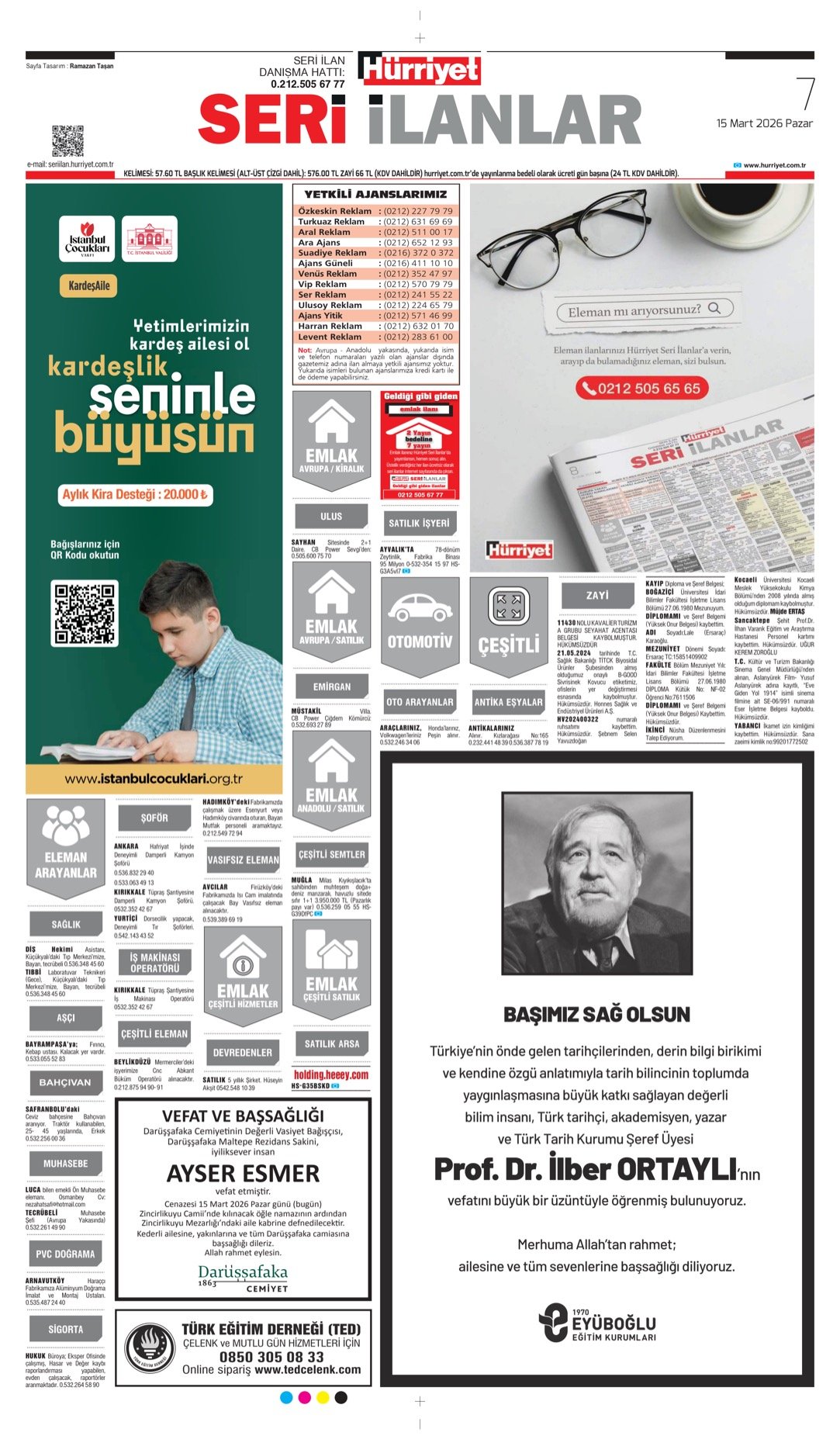 Hürriyet Bugünkü Vefat (Ölüm) – Başsağlığı – Anma – Teşekkür – Mevlit İlanları-15.3.2026