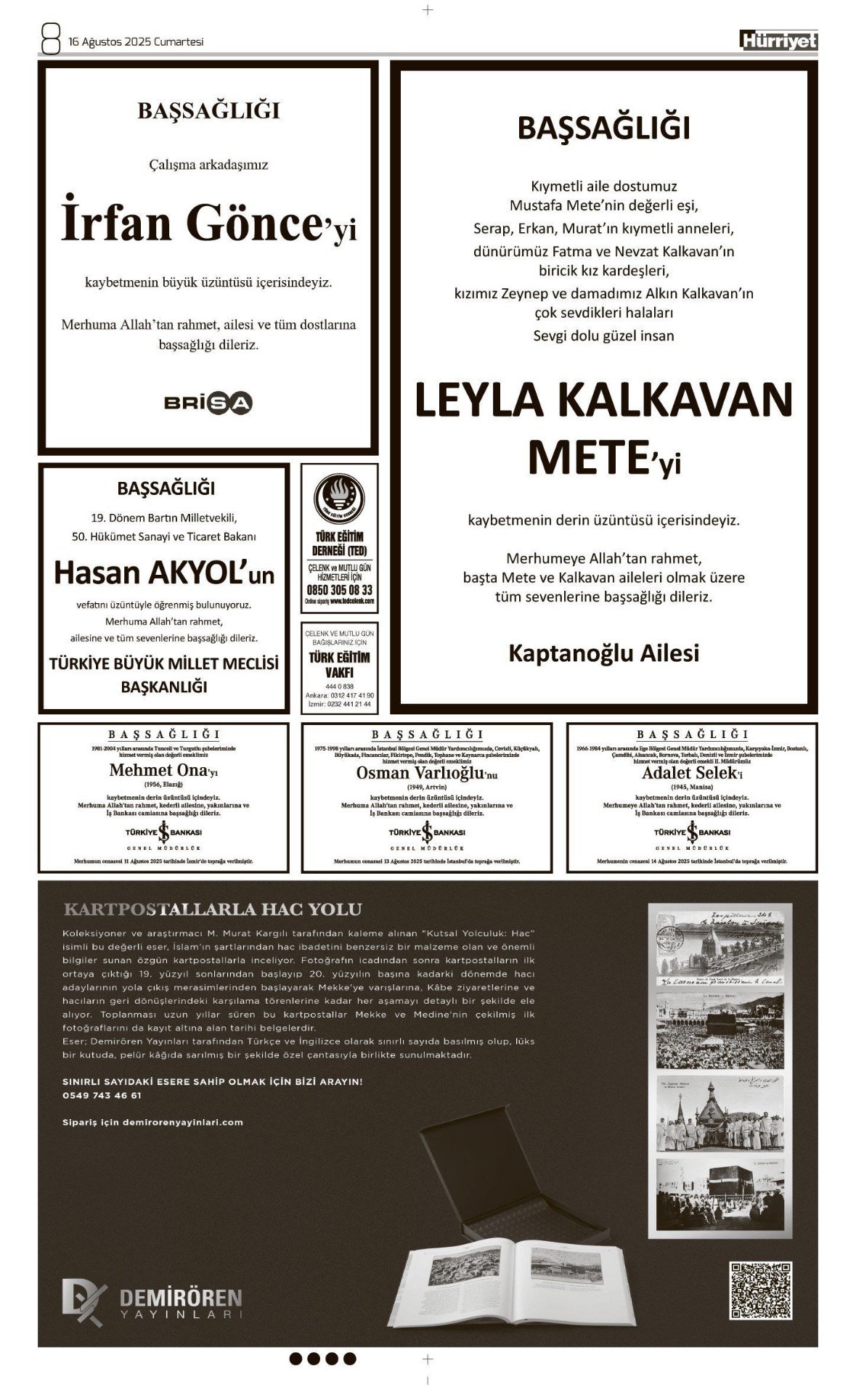 Hürriyet Bugünkü Vefat (Ölüm) – Başsağlığı – Anma – Teşekkür – Mevlit İlanları-16.8.2025