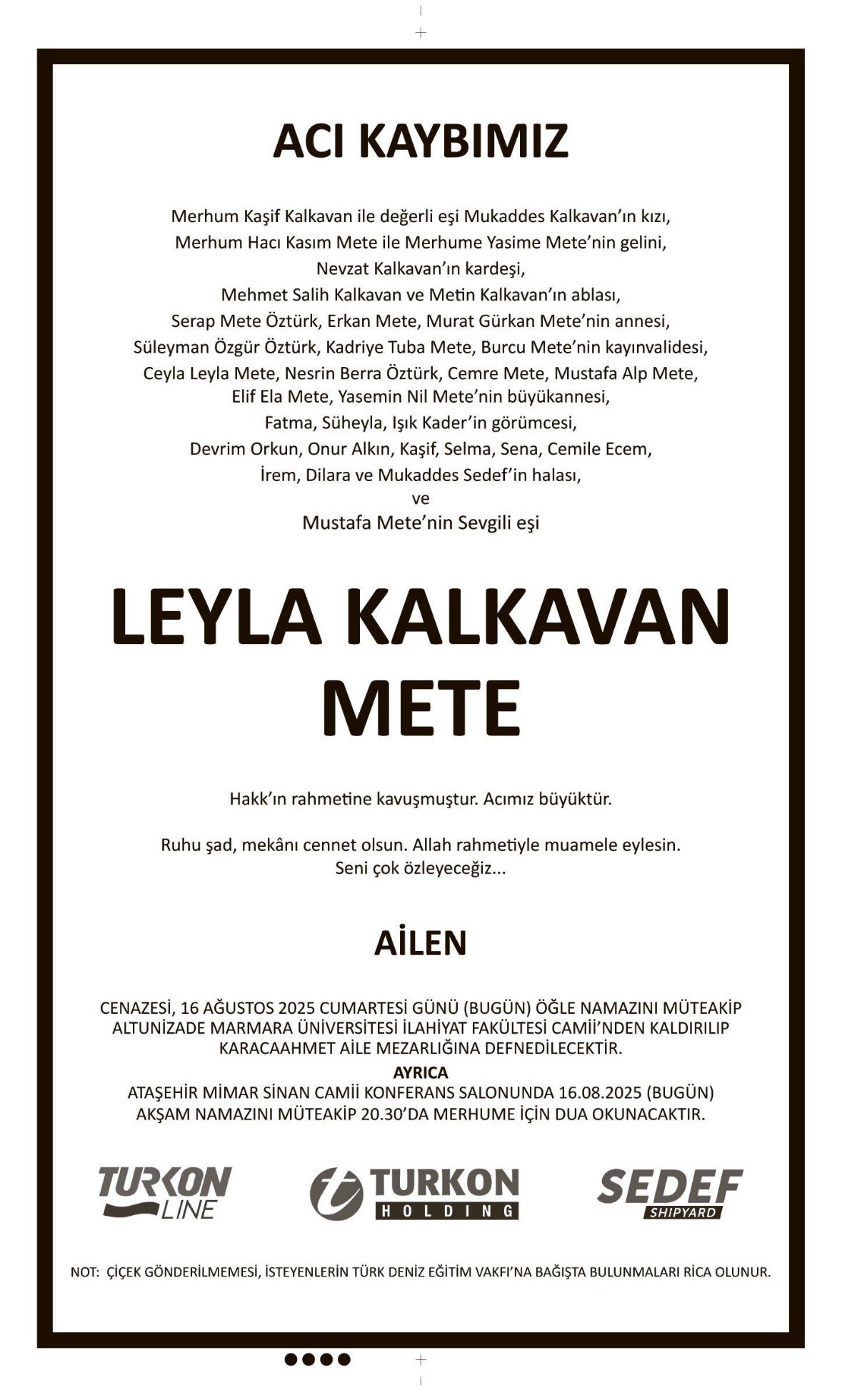 - LEYLA KALKAVAN METE – VEFAT İLANI,