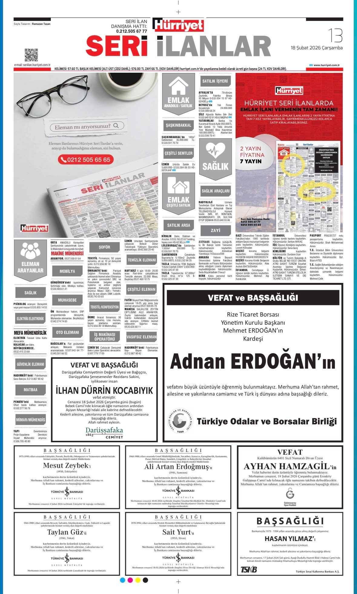 Hürriyet Bugünkü Vefat (Ölüm) – Başsağlığı – Anma – Teşekkür – Mevlit İlanları-18.2.2026