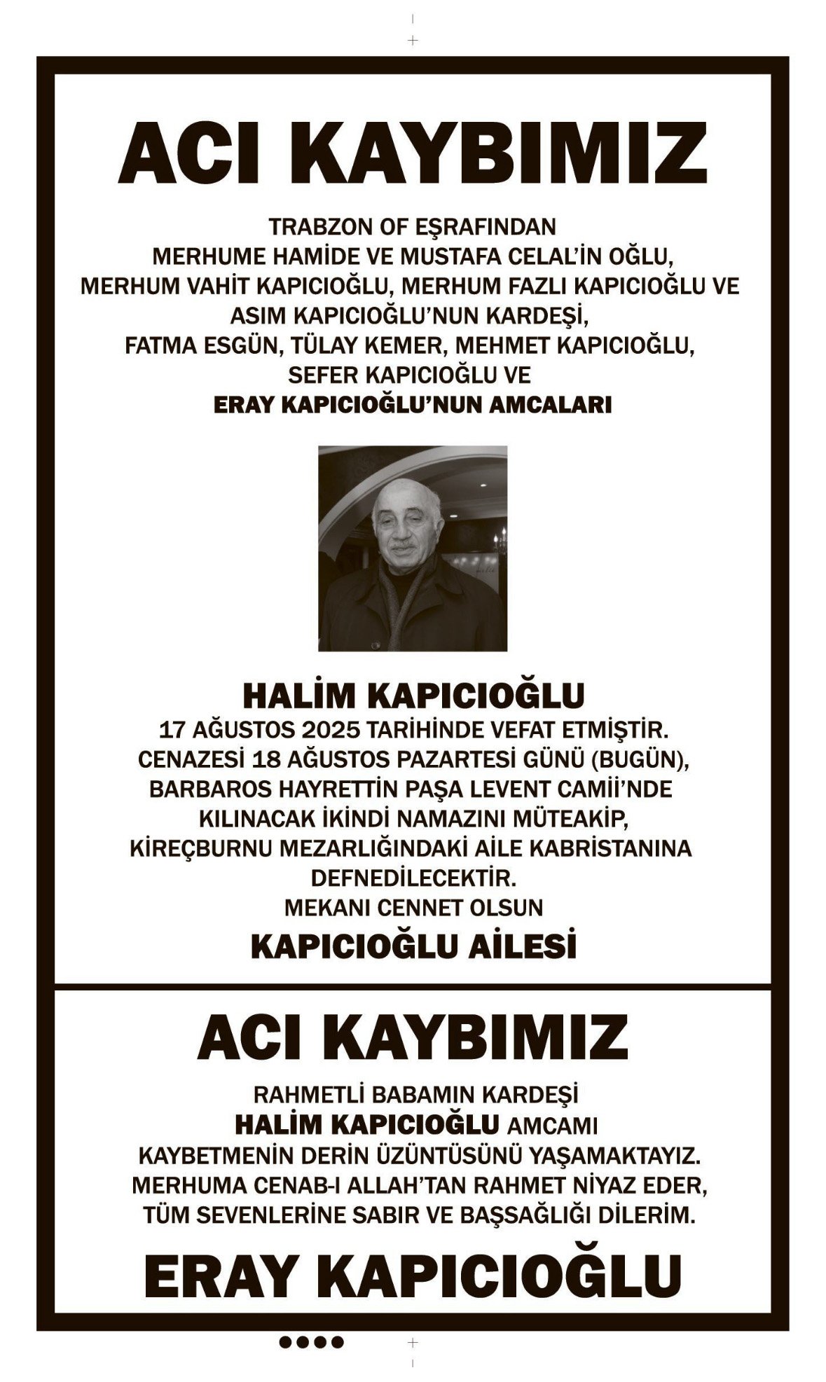 - HALİM KAPICIOĞLU – VEFAT İLANI,