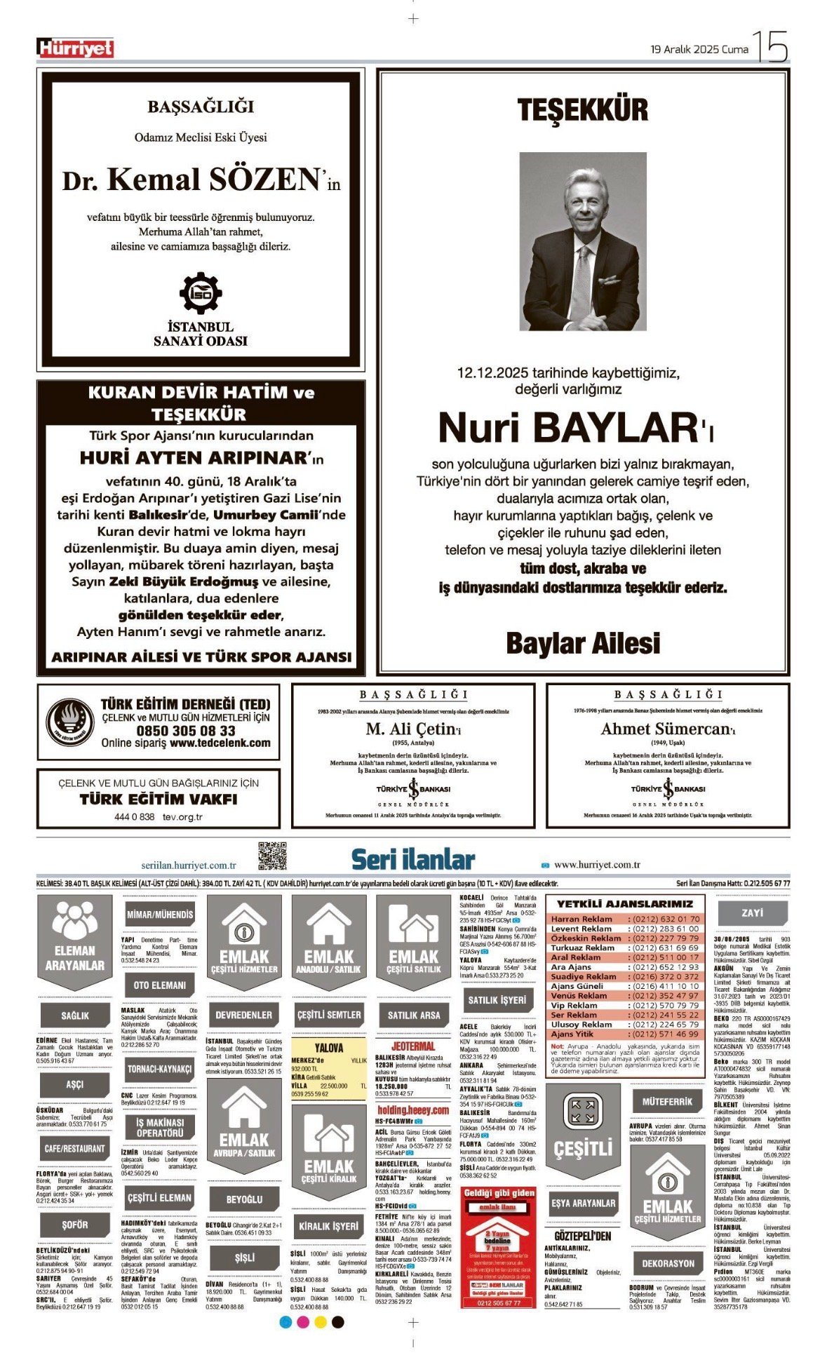 Hürriyet Bugünkü Vefat (Ölüm) – Başsağlığı – Anma – Teşekkür – Mevlit İlanları-19.12.2025