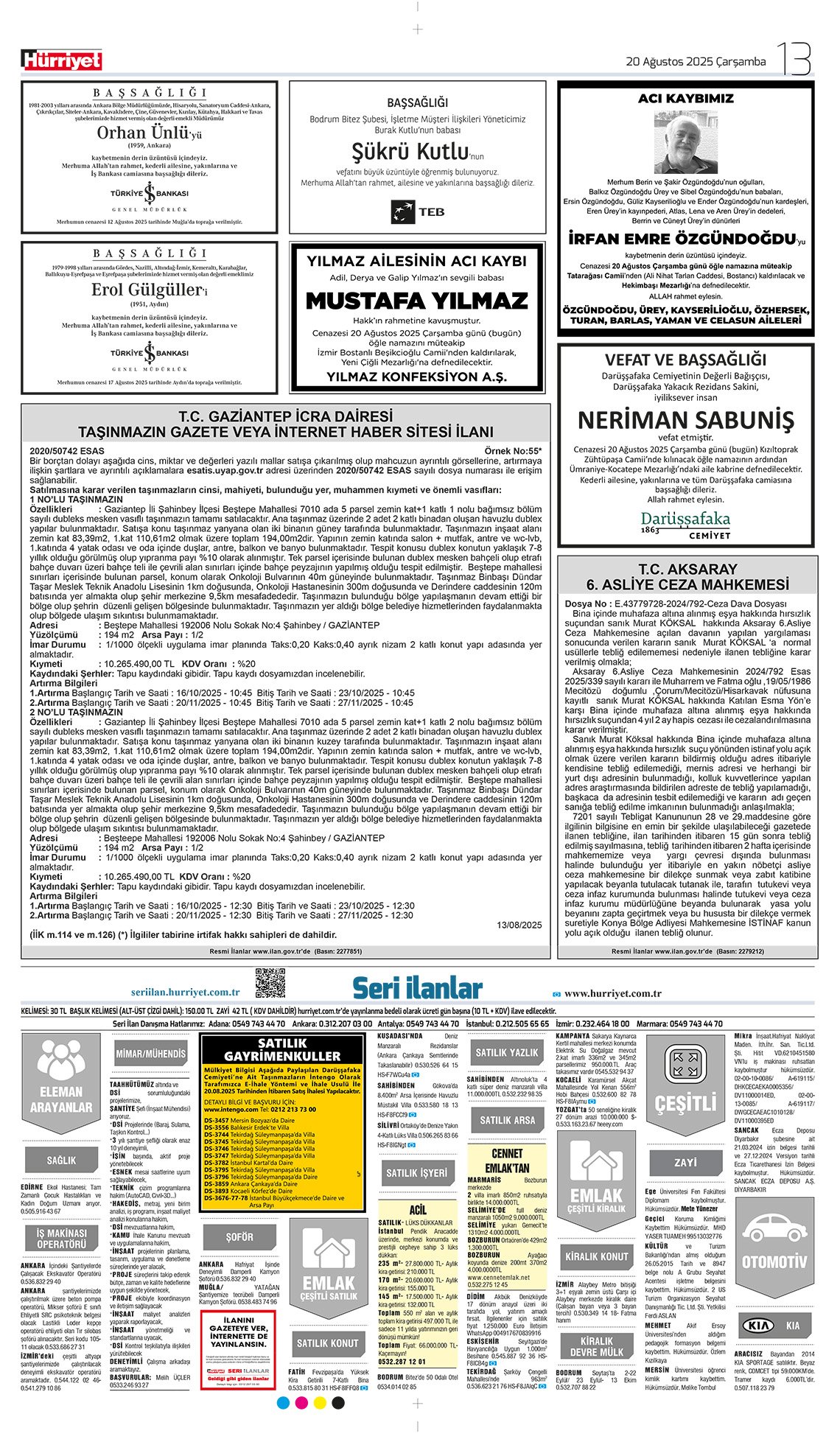 Hürriyet Bugünkü Vefat (Ölüm) – Başsağlığı – Anma – Teşekkür – Mevlit İlanları-20.8.2025
