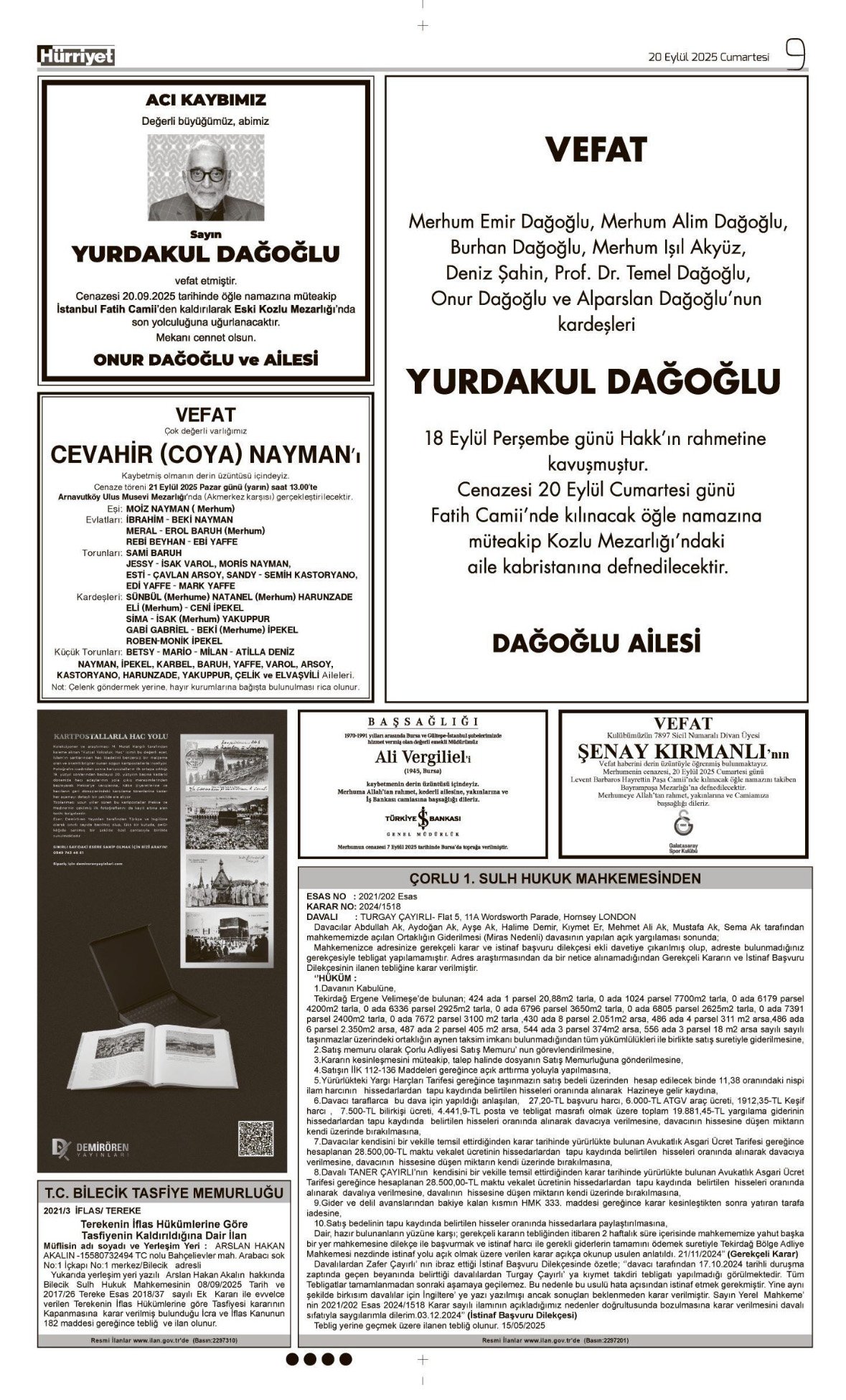 Hürriyet Bugünkü Vefat (Ölüm) – Başsağlığı – Anma – Teşekkür – Mevlit İlanları-20.9.2025
