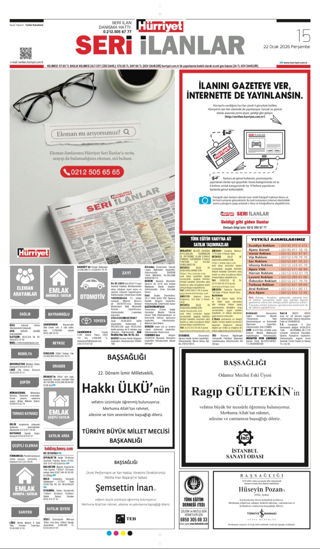Hürriyet Bugünkü Vefat (Ölüm) – Başsağlığı – Anma – Teşekkür – Mevlit İlanları-22.1.2026