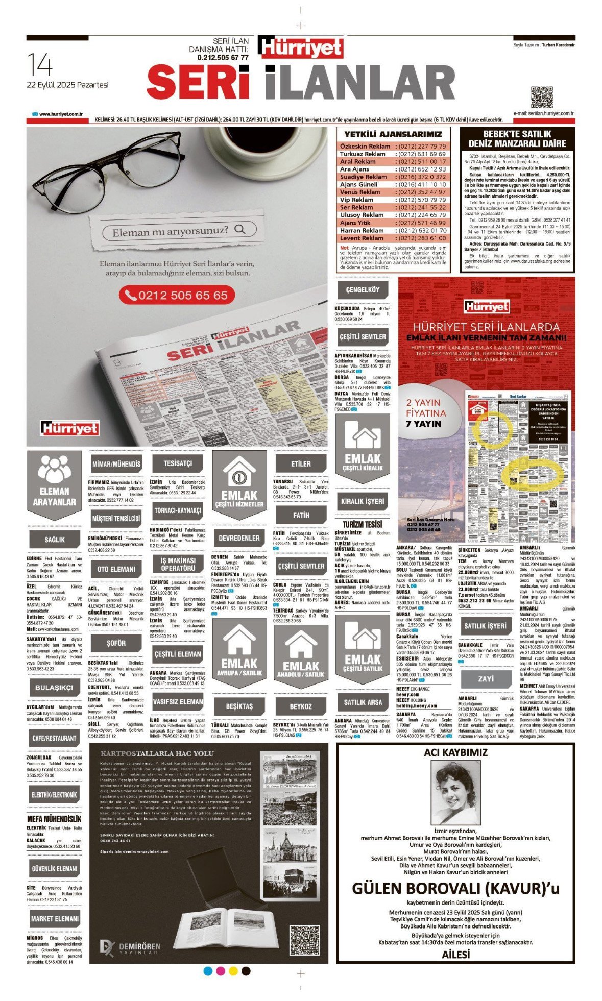Hürriyet Bugünkü Vefat (Ölüm) – Başsağlığı – Anma – Teşekkür – Mevlit İlanları-22.9.2025