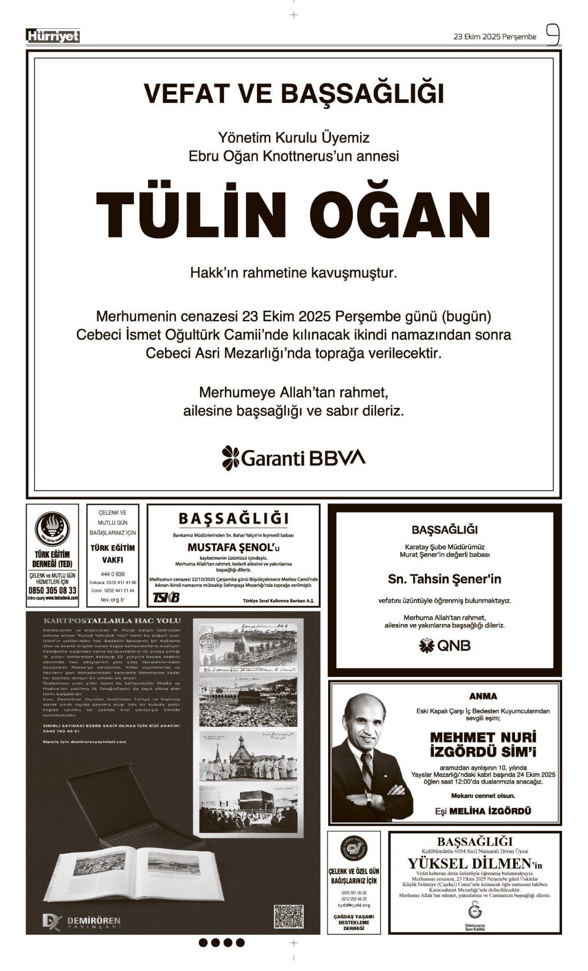 Hürriyet Bugünkü Vefat (Ölüm) – Başsağlığı – Anma – Teşekkür – Mevlit İlanları-23.10.2025