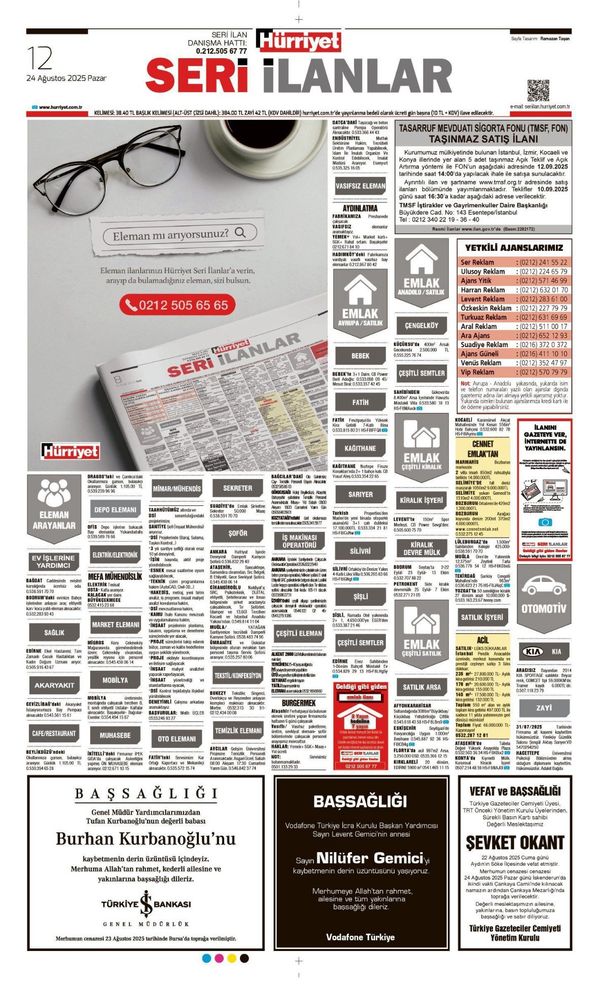 Hürriyet Bugünkü Vefat (Ölüm) – Başsağlığı – Anma – Teşekkür – Mevlit İlanları-24.8.2025