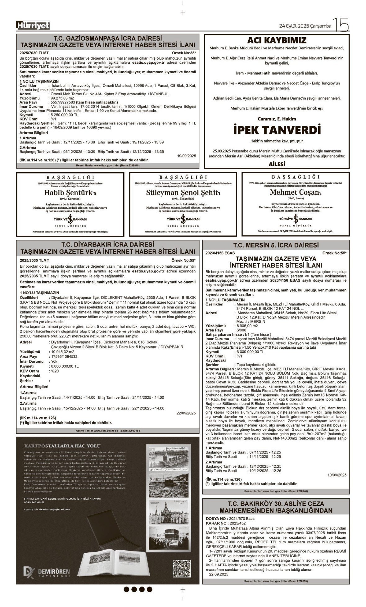 Hürriyet Bugünkü Vefat (Ölüm) – Başsağlığı – Anma – Teşekkür – Mevlit İlanları-24.9.2025