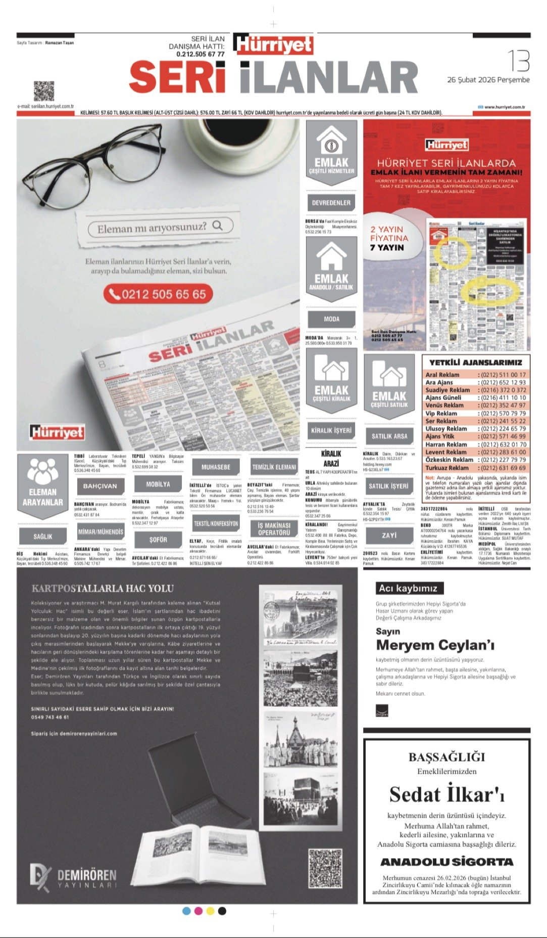 Hürriyet Bugünkü Vefat (Ölüm) – Başsağlığı – Anma – Teşekkür – Mevlit İlanları-26.2.2026