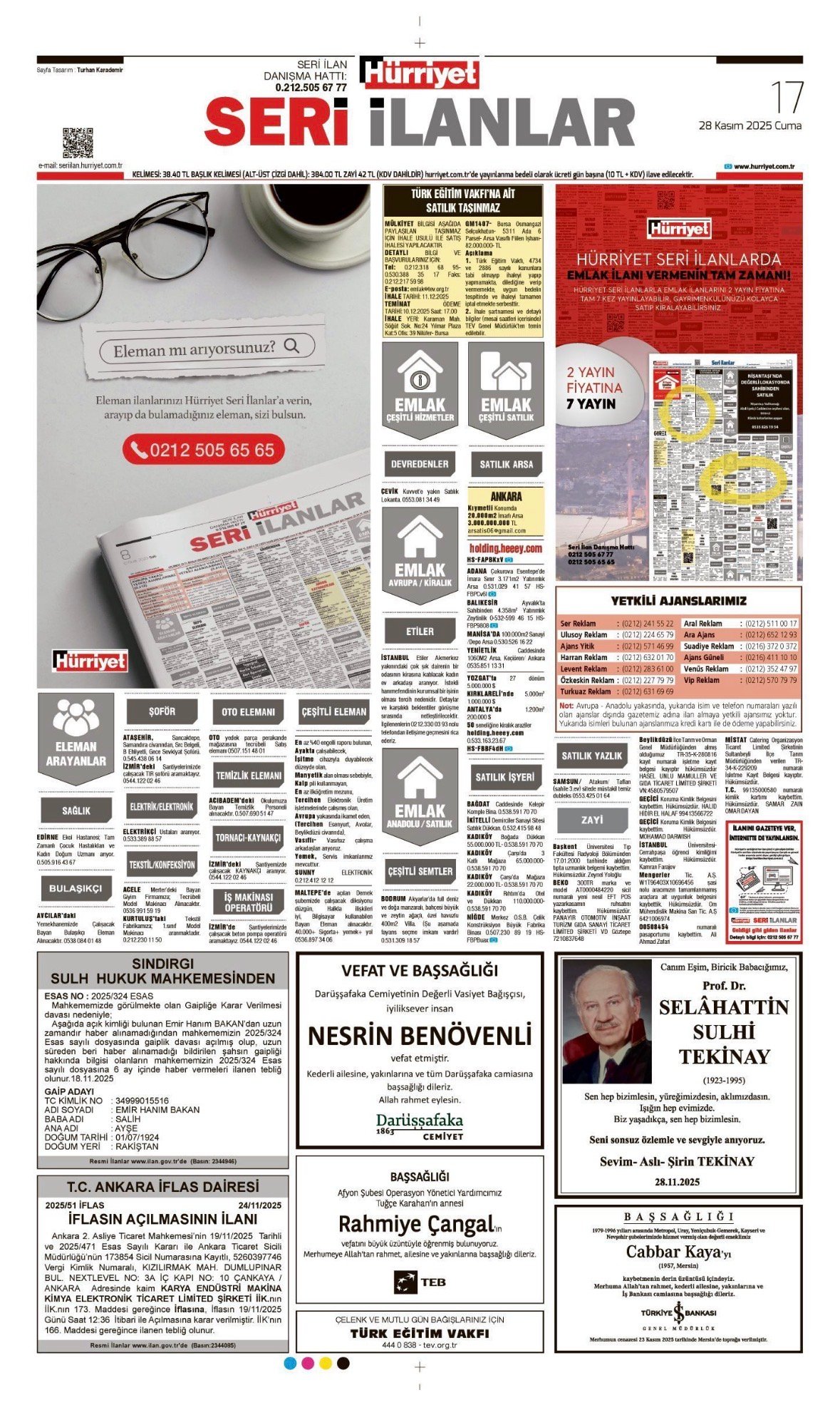 Hürriyet Bugünkü Vefat (Ölüm) – Başsağlığı – Anma – Teşekkür – Mevlit İlanları-28.11.2025
