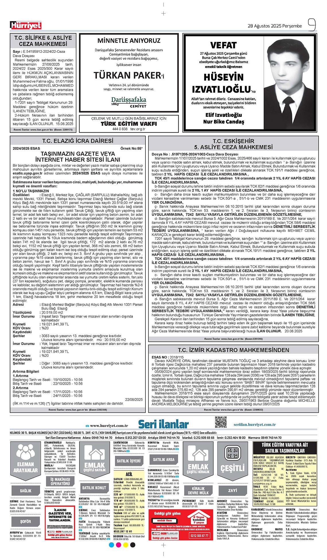Hürriyet Bugünkü Vefat (Ölüm) – Başsağlığı – Anma – Teşekkür – Mevlit İlanları-28.8.2025