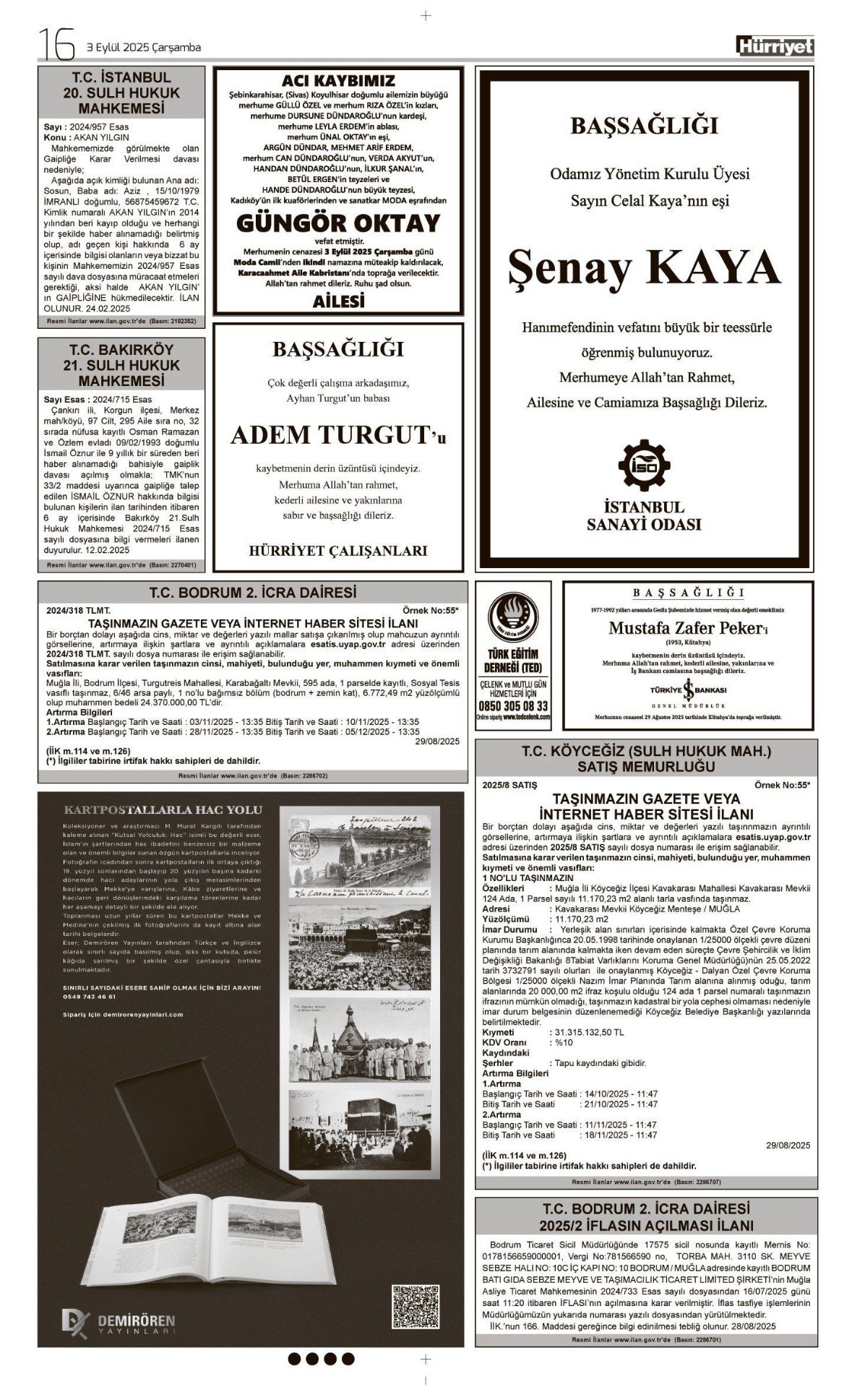 Hürriyet Bugünkü Vefat (Ölüm) – Başsağlığı – Anma – Teşekkür – Mevlit İlanları-3.9.2025