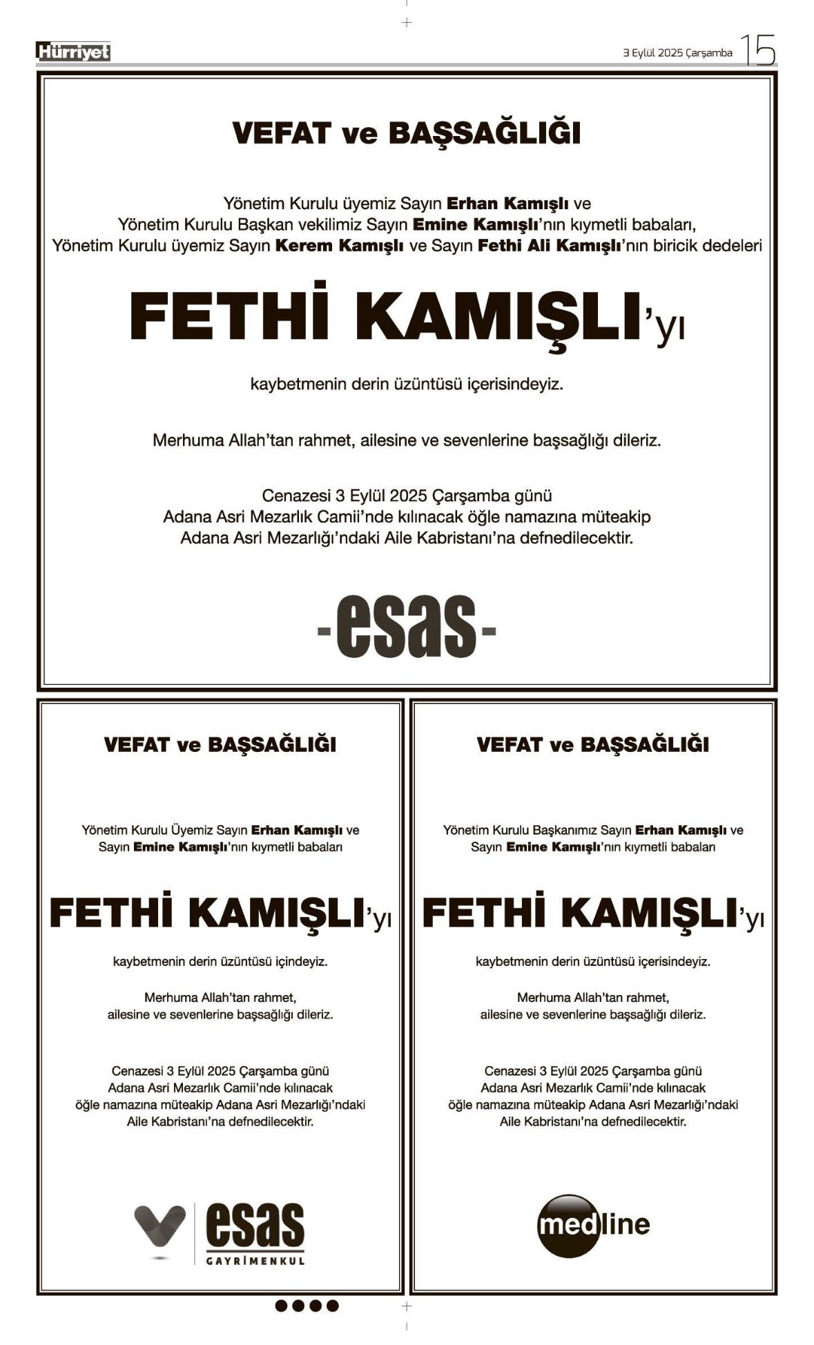 - FEHMİ KAMIŞLI – VEFAT İLANI,