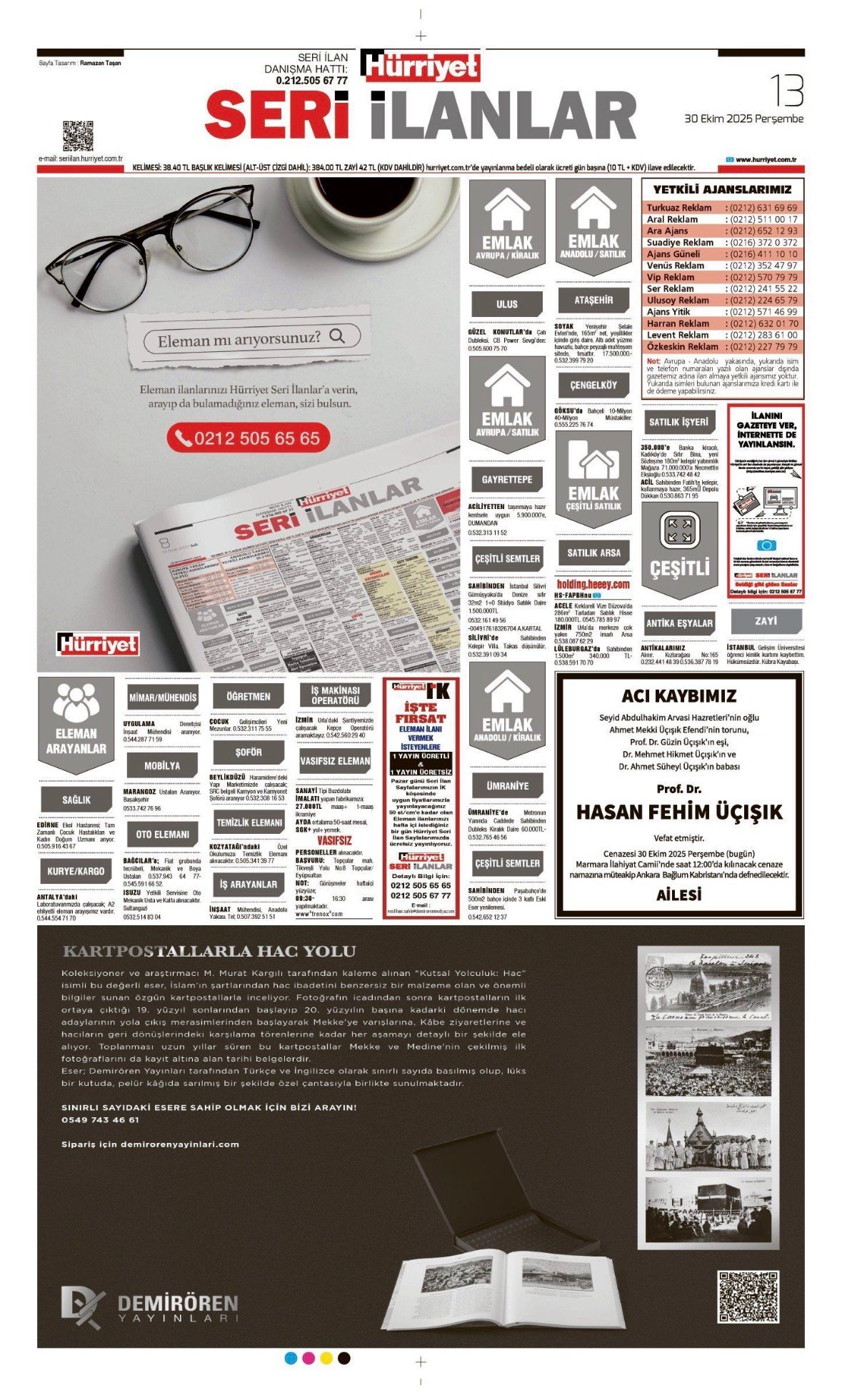 Hürriyet Bugünkü Vefat (Ölüm) – Başsağlığı – Anma – Teşekkür – Mevlit İlanları-30.10.2025