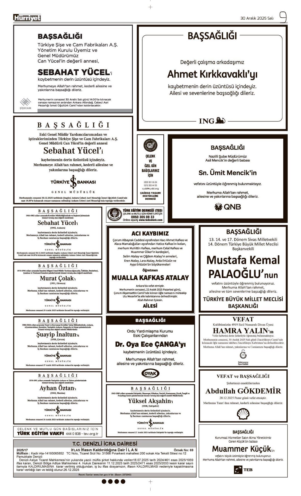 Hürriyet Bugünkü Vefat (Ölüm) – Başsağlığı – Anma – Teşekkür – Mevlit İlanları-30.12.2025