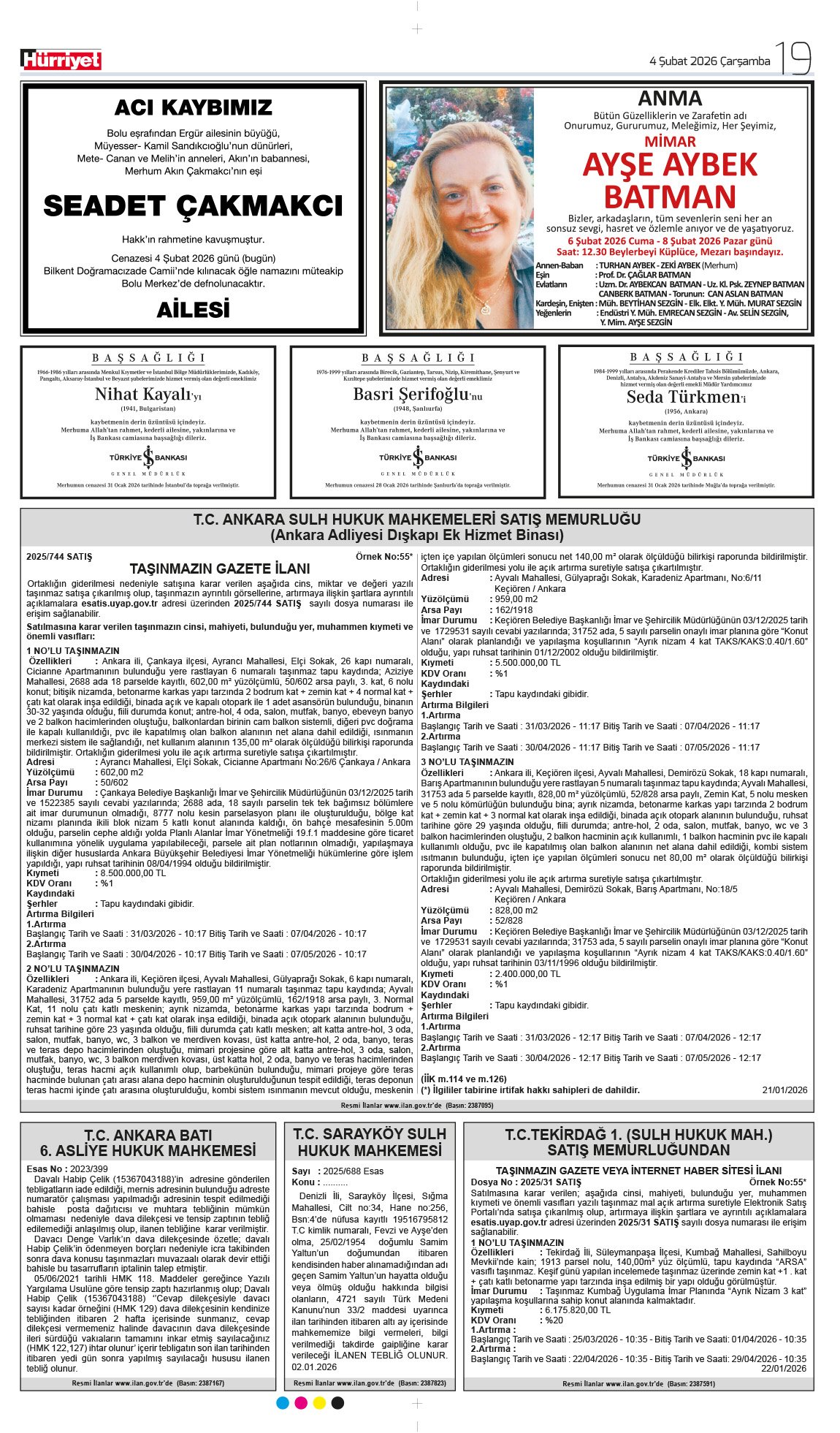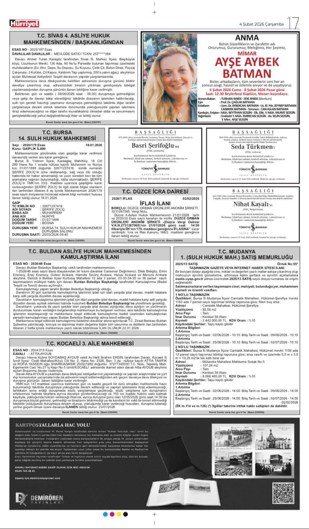 Hürriyet Bugünkü Vefat (Ölüm) – Başsağlığı – Anma – Teşekkür – Mevlit İlanları-3.2.2026