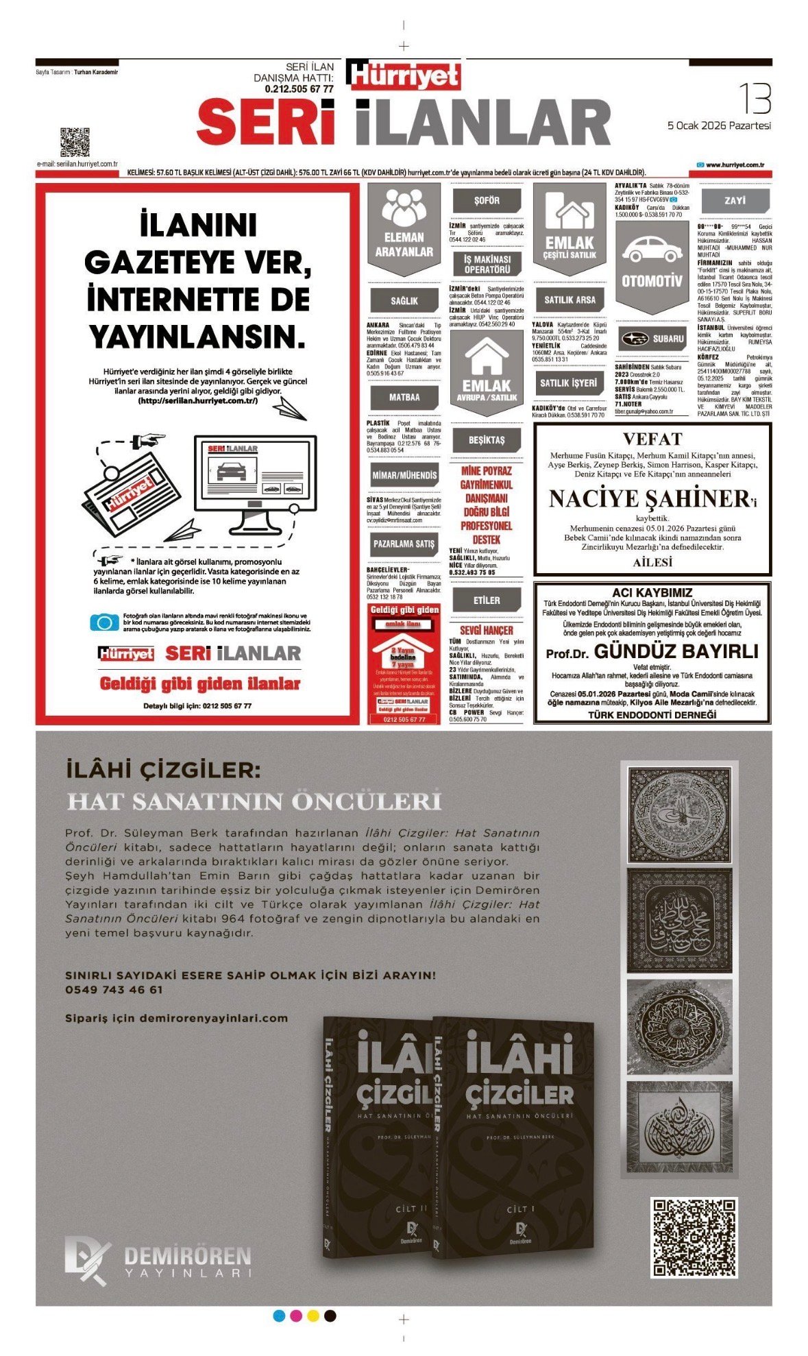 Hürriyet Bugünkü Vefat (Ölüm) – Başsağlığı – Anma – Teşekkür – Mevlit İlanları-5.1.2026