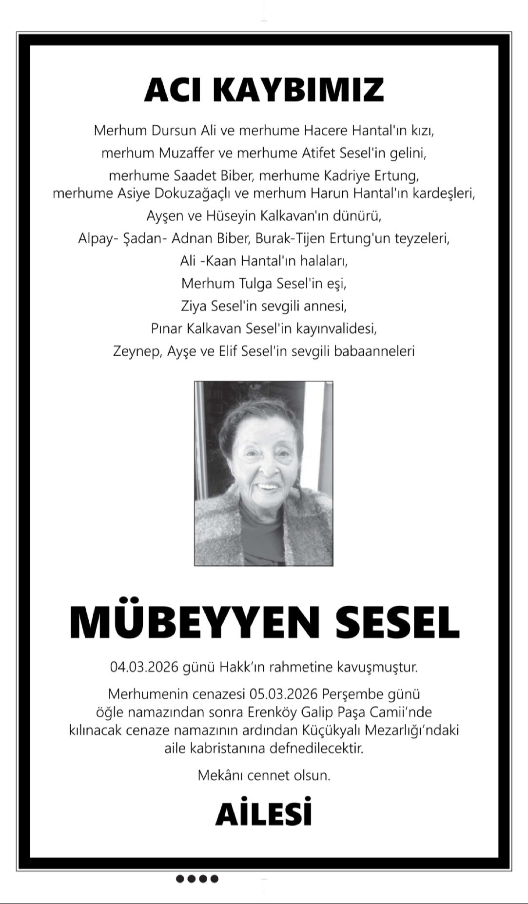 • MÜBEYYEN SESEL – Vefat İlanı,