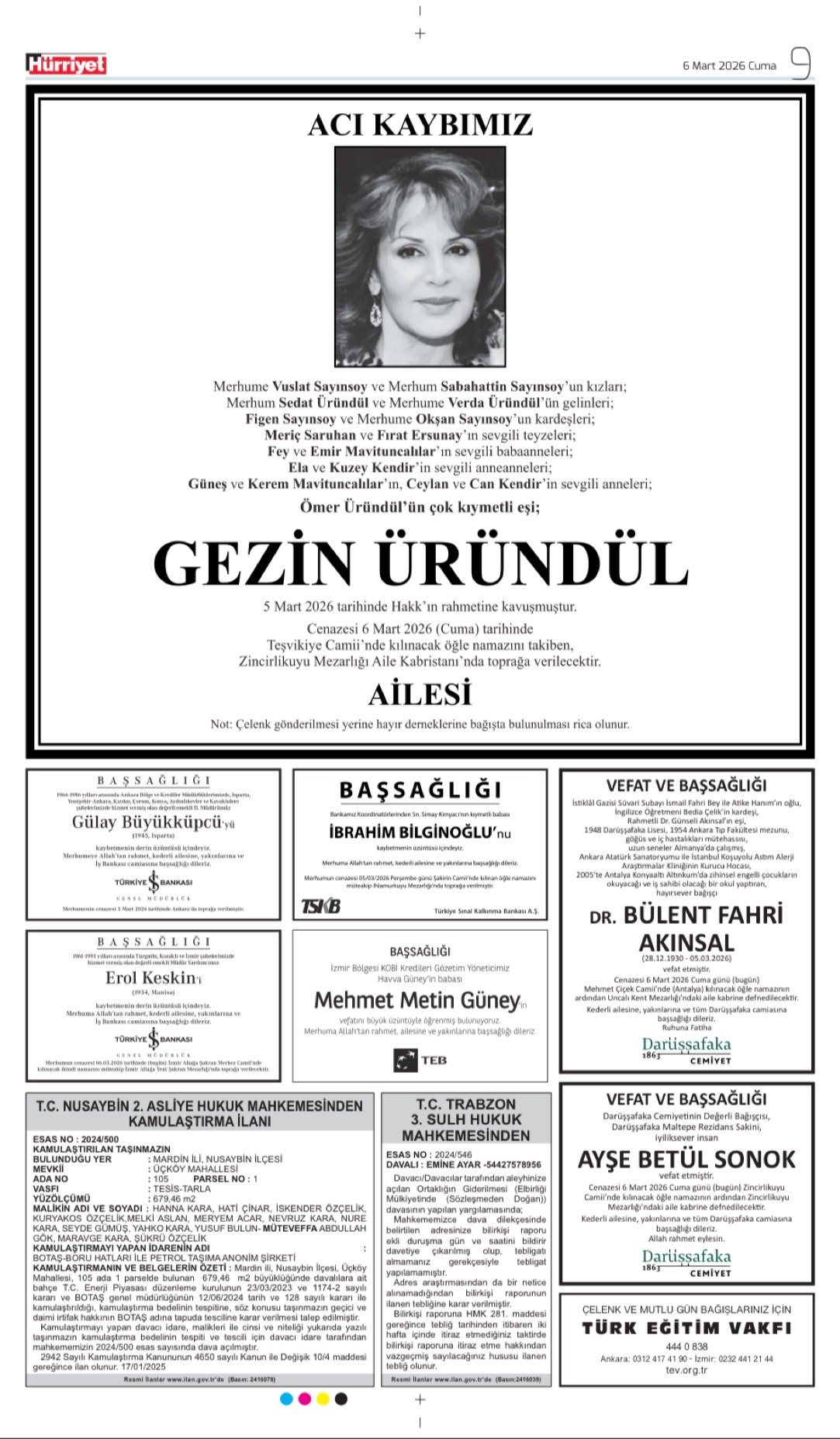 Hürriyet Bugünkü Vefat (Ölüm) – Başsağlığı – Anma – Teşekkür – Mevlit İlanları-6.3.2026