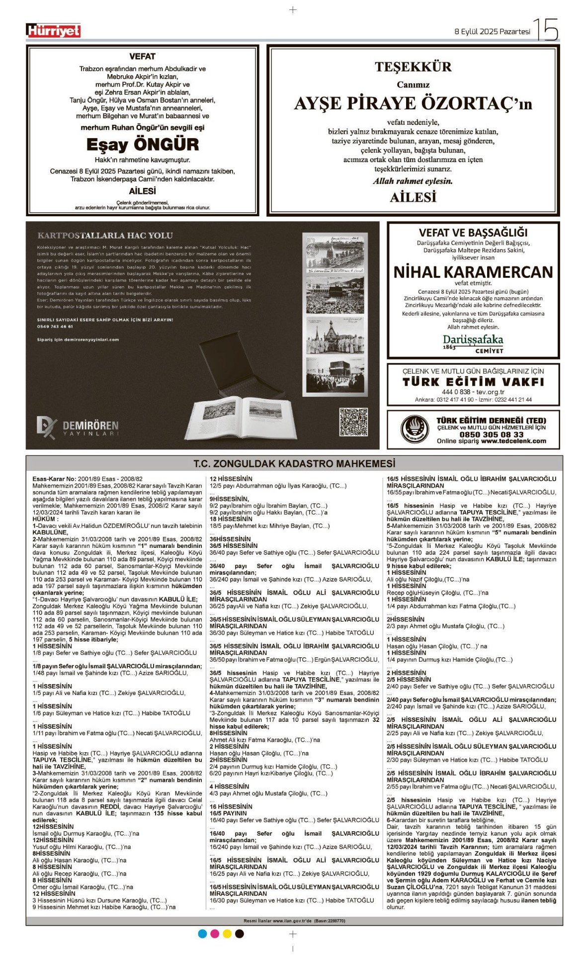 Hürriyet Bugünkü Vefat (Ölüm) – Başsağlığı – Anma – Teşekkür – Mevlit İlanları-8.9.2025