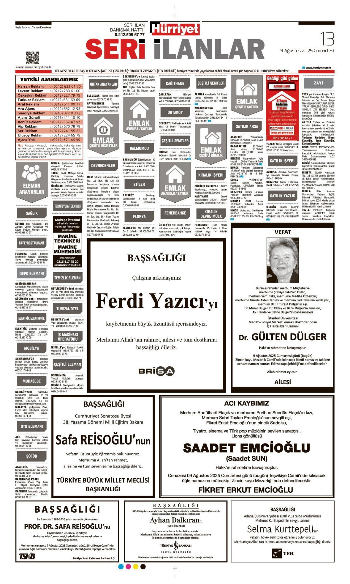 Hürriyet Bugünkü Vefat (Ölüm) – Başsağlığı – Anma – Teşekkür – Mevlit İlanları-9.8.2025